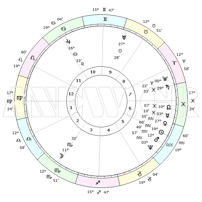 | | ΘΕΣΕΙΣ ΠΛΑΝΗΤΩΝ ΑΣΤΡΟΛΟΓΙΚΟΥ ΧΑΡΤΗ ΤΗΣ ΣΤΙΓΜΗΣ ΑΥΤΗΣ | | | | Πλανήτης | Ζώδιο | Μοίρες | Δεκαήμ. | Σε οίκο | Απόκλιση | | Ακμές των οίκων | | Ηλιος | Υδροχόος | 19°56' | Δεύτερο | 6 | 14 S 50 | | 1ος | 28°31' | Λέων | | Σελήνη | Σκορπιός | 10°45' | Δεύτερο | 3 | 19 S 26 | | 2ος | 22°13' | Παρθένος | | Ερμής | Ιχθείς | 03°03' | Πρώτο | 7 | 11 S 25 | | 3ος | 20°45' | Ζυγός | | Αφροδίτη | Υδροχόος | 27°50' | Τρίτο | 6 | 13 S 35 | | 4ος | 23°38' | Σκορπιός | | Αρης | Υδροχόος | 12°46' | Δεύτερο | 6 | 18 S 00 | | 5ος | 27°56' | Τοξότης | | Δίας | Καρκίνος | 16°34'R | Δεύτερο | 11 | 22 N 43 | | 6ος | 00°01' | Υδροχόος | | Κρόνος | Ιχθείς | 29°33' | Τρίτο | 8 | 02 S 10 | | 7ος | 28°31' | Υδροχόος | | Ουρανός | Ταύρος | 27°28' | Τρίτο | 10 | 19 N 24 | | 8ος | 22°13' | Ιχθείς | | Ποσειδώνας | Κριός | 00°22' | Πρώτο | 8 | 01 S 03 | | 9ος | 20°45' | Κριός | | Πλούτωνας | Υδροχόος | 03°57' | Πρώτο | 6 | 22 S 59 | | 10ος | 23°38' | Ταύρος | | Β. Δεσμός | Ιχθείς | 10°07' | Δεύτερο | 7 | 07 S 46 | | 11ος | 27°56' | Δίδυμοι | | Ωροσκόπος | Λέων | 28°31' | Τρίτο | | | 12ος | 00°01' | Λέων | | Μεσουράνημα | Ταύρος | 23°38' | Τρίτο | | | |