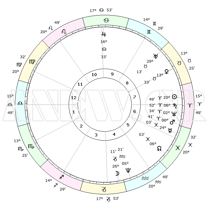 | | ΘΕΣΕΙΣ ΠΛΑΝΗΤΩΝ ΑΣΤΡΟΛΟΓΙΚΟΥ ΧΑΡΤΗ ΤΗΣ ΣΤΙΓΜΗΣ ΑΥΤΗΣ | | | | Πλανήτης | Ζώδιο | Μοίρες | Δεκαήμ. | Σε οίκο | Απόκλιση | | Ακμές των οίκων | | Ηλιος | Κριός | 20°45' | Τρίτο | 7 | 08 N 06 | | 1ος | 25°45' | Παρθένος | | Σελήνη | Αιγόκερως | 25°22' | Τρίτο | 4 | 24 S 31 | | 2ος | 22°02' | Ζυγός | | Ερμής | Ιχθείς | 23°58' | Τρίτο | 6 | 04 S 35 | | 3ος | 22°18' | Σκορπιός | | Αφροδίτη | Ταύρος | 13°28' | Δεύτερο | 8 | 15 N 51 | | 4ος | 25°14' | Τοξότης | | Αρης | Κριός | 00°38' | Πρώτο | 7 | 00 S 40 | | 5ος | 28°17' | Αιγόκερως | | Δίας | Καρκίνος | 16°32' | Δεύτερο | 10 | 22 N 47 | | 6ος | 28°52' | Υδροχόος | | Κρόνος | Κριός | 06°51' | Πρώτο | 7 | 00 N 45 | | 7ος | 25°45' | Ιχθείς | | Ουρανός | Ταύρος | 29°12' | Τρίτο | 9 | 19 N 49 | | 8ος | 22°02' | Κριός | | Ποσειδώνας | Κριός | 02°34' | Πρώτο | 7 | 00 S 11 | | 9ος | 22°18' | Ταύρος | | Πλούτωνας | Υδροχόος | 05°21' | Πρώτο | 5 | 22 S 47 | | 10ος | 25°14' | Δίδυμοι | | Β. Δεσμός | Ιχθείς | 06°54' | Πρώτο | 6 | 08 S 59 | | 11ος | 28°17' | Καρκίνος | | Ωροσκόπος | Παρθένος | 25°45' | Τρίτο | | | 12ος | 28°52' | Λέων | | Μεσουράνημα | Δίδυμοι | 25°14' | Τρίτο | | | |