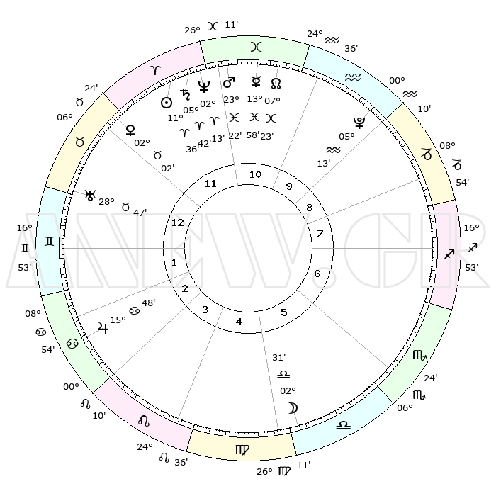 | | ΘΕΣΕΙΣ ΠΛΑΝΗΤΩΝ ΑΣΤΡΟΛΟΓΙΚΟΥ ΧΑΡΤΗ ΤΗΣ ΣΤΙΓΜΗΣ ΑΥΤΗΣ | | | | Πλανήτης | Ζώδιο | Μοίρες | Δεκαήμ. | Σε οίκο | Απόκλιση | | Ακμές των οίκων | | Ηλιος | Κριός | 11°32' | Δεύτερο | 12 | 04 N 34 | | 1ος | 20°60' | Ταύρος | | Σελήνη | Ζυγός | 01°42' | Πρώτο | 5 | 02 S 33 | | 2ος | 17°46' | Δίδυμοι | | Ερμής | Ιχθείς | 13°55' | Δεύτερο | 11 | 07 S 34 | | 3ος | 09°37' | Καρκίνος | | Αφροδίτη | Ταύρος | 01°58' | Πρώτο | 12 | 11 N 45 | | 4ος | 01°50' | Λέων | | Αρης | Ιχθείς | 23°19' | Τρίτο | 11 | 03 S 36 | | 5ος | 28°50' | Λέων | | Δίας | Καρκίνος | 15°48' | Δεύτερο | 3 | 22 N 52 | | 6ος | 05°43' | Ζυγός | | Κρόνος | Κριός | 05°42' | Πρώτο | 11 | 00 N 18 | | 7ος | 20°60' | Σκορπιός | | Ουρανός | Ταύρος | 28°46' | Τρίτο | 1 | 19 N 43 | | 8ος | 17°46' | Τοξότης | | Ποσειδώνας | Κριός | 02°13' | Πρώτο | 11 | 00 S 19 | | 9ος | 09°37' | Αιγόκερως | | Πλούτωνας | Υδροχόος | 05°13' | Πρώτο | 10 | 22 S 47 | | 10ος | 01°50' | Υδροχόος | | Β. Δεσμός | Ιχθείς | 07°23' | Πρώτο | 11 | 08 S 48 | | 11ος | 28°50' | Υδροχόος | | Ωροσκόπος | Ταύρος | 20°60' | Τρίτο | | | 12ος | 05°43' | Κριός | | Μεσουράνημα | Υδροχόος | 01°50' | Πρώτο | | | |