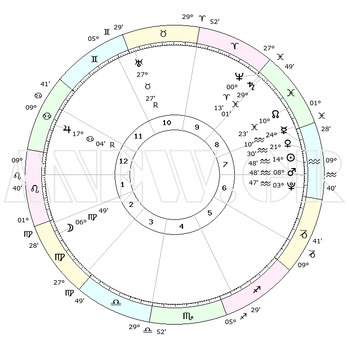 | | ΘΕΣΕΙΣ ΠΛΑΝΗΤΩΝ ΑΣΤΡΟΛΟΓΙΚΟΥ ΧΑΡΤΗ ΤΗΣ ΣΤΙΓΜΗΣ ΑΥΤΗΣ | | | | Πλανήτης | Ζώδιο | Μοίρες | Δεκαήμ. | Σε οίκο | Απόκλιση | | Ακμές των οίκων | | Ηλιος | Υδροχόος | 14°45' | Δεύτερο | 8 | 16 S 24 | | 1ος | 21°09' | Καρκίνος | | Σελήνη | Παρθένος | 05°57' | Πρώτο | 3 | 09 N 35 | | 2ος | 11°44' | Λέων | | Ερμής | Υδροχόος | 24°03' | Τρίτο | 8 | 15 S 06 | | 3ος | 05°37' | Παρθένος | | Αφροδίτη | Υδροχόος | 21°25' | Τρίτο | 8 | 15 S 41 | | 4ος | 05°25' | Ζυγός | | Αρης | Υδροχόος | 08°45' | Πρώτο | 7 | 19 S 05 | | 5ος | 11°26' | Σκορπιός | | Δίας | Καρκίνος | 17°05'R | Δεύτερο | 12 | 22 N 39 | | 6ος | 18°38' | Τοξότης | | Κρόνος | Ιχθείς | 29°01' | Τρίτο | 9 | 02 S 23 | | 7ος | 21°09' | Αιγόκερως | | Ουρανός | Ταύρος | 27°27'R | Τρίτο | 11 | 19 N 24 | | 8ος | 11°44' | Υδροχόος | | Ποσειδώνας | Κριός | 00°13' | Πρώτο | 9 | 01 S 07 | | 9ος | 05°37' | Ιχθείς | | Πλούτωνας | Υδροχόος | 03°47' | Πρώτο | 7 | 23 S 00 | | 10ος | 05°25' | Κριός | | Β. Δεσμός | Ιχθείς | 10°23' | Δεύτερο | 9 | 07 S 40 | | 11ος | 11°26' | Ταύρος | | Ωροσκόπος | Καρκίνος | 21°09' | Τρίτο | | | 12ος | 18°38' | Δίδυμοι | | Μεσουράνημα | Κριός | 05°25' | Πρώτο | | | |