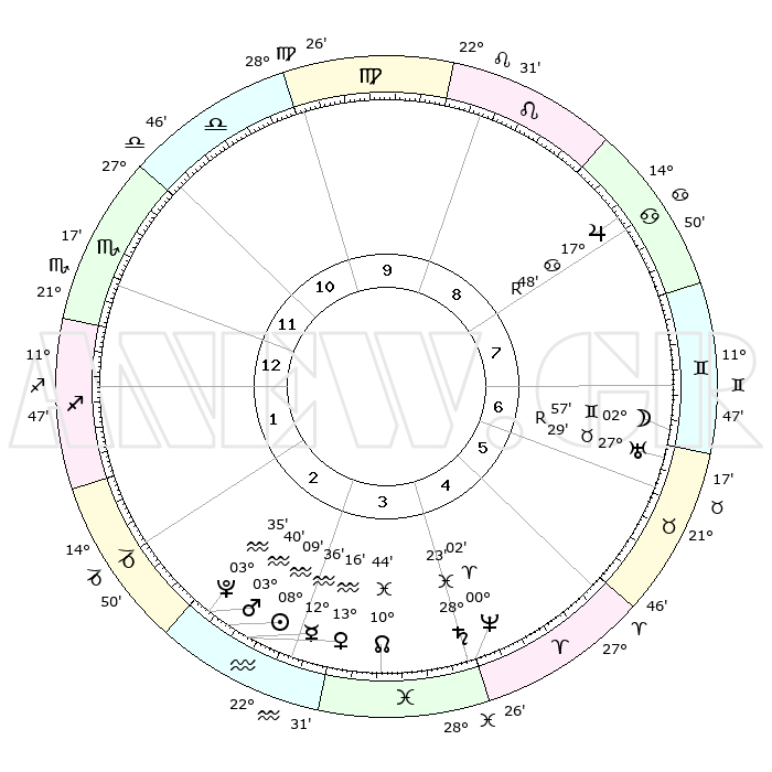 | | ΘΕΣΕΙΣ ΠΛΑΝΗΤΩΝ ΑΣΤΡΟΛΟΓΙΚΟΥ ΧΑΡΤΗ ΤΗΣ ΣΤΙΓΜΗΣ ΑΥΤΗΣ | | | | Πλανήτης | Ζώδιο | Μοίρες | Δεκαήμ. | Σε οίκο | Απόκλιση | | Ακμές των οίκων | | Ηλιος | Υδροχόος | 08°04' | Πρώτο | 3 | 18 S 15 | | 1ος | 21°09' | Σκορπιός | | Σελήνη | Δίδυμοι | 01°57' | Πρώτο | 7 | 25 N 36 | | 2ος | 21°13' | Τοξότης | | Ερμής | Υδροχόος | 12°29' | Δεύτερο | 3 | 19 S 01 | | 3ος | 25°32' | Αιγόκερως | | Αφροδίτη | Υδροχόος | 13°11' | Δεύτερο | 3 | 18 S 06 | | 4ος | 01°12' | Ιχθείς | | Αρης | Υδροχόος | 03°37' | Πρώτο | 3 | 20 S 20 | | 5ος | 03°11' | Κριός | | Δίας | Καρκίνος | 17°49'R | Δεύτερο | 8 | 22 N 33 | | 6ος | 29°25' | Κριός | | Κρόνος | Ιχθείς | 28°22' | Τρίτο | 4 | 02 S 39 | | 7ος | 21°09' | Ταύρος | | Ουρανός | Ταύρος | 27°29'R | Τρίτο | 7 | 19 N 24 | | 8ος | 21°13' | Δίδυμοι | | Ποσειδώνας | Κριός | 00°02' | Πρώτο | 4 | 01 S 12 | | 9ος | 25°32' | Καρκίνος | | Πλούτωνας | Υδροχόος | 03°34' | Πρώτο | 3 | 23 S 03 | | 10ος | 01°12' | Παρθένος | | Β. Δεσμός | Ιχθείς | 10°44' | Δεύτερο | 4 | 07 S 32 | | 11ος | 03°11' | Ζυγός | | Ωροσκόπος | Σκορπιός | 21°09' | Τρίτο | | | 12ος | 29°25' | Ζυγός | | Μεσουράνημα | Παρθένος | 01°12' | Πρώτο | | | |