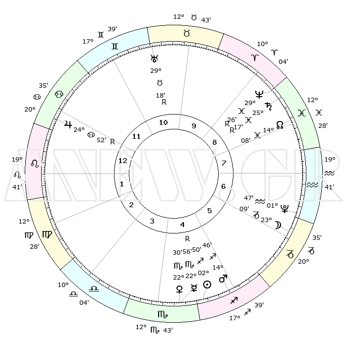 | | ΘΕΣΕΙΣ ΠΛΑΝΗΤΩΝ ΑΣΤΡΟΛΟΓΙΚΟΥ ΧΑΡΤΗ ΤΗΣ ΣΤΙΓΜΗΣ ΑΥΤΗΣ | | | | Πλανήτης | Ζώδιο | Μοίρες | Δεκαήμ. | Σε οίκο | Απόκλιση | | Ακμές των οίκων | | Ηλιος | Τοξότης | 02°47' | Πρώτο | 5 | 20 S 43 | | 1ος | 05°12' | Λέων | | Σελήνη | Αιγόκερως | 22°32' | Τρίτο | 6 | 25 S 27 | | 2ος | 26°37' | Λέων | | Ερμής | Σκορπιός | 22°59'R | Τρίτο | 4 | 16 S 44 | | 3ος | 22°23' | Παρθένος | | Αφροδίτη | Σκορπιός | 22°26' | Τρίτο | 4 | 17 S 29 | | 4ος | 24°00' | Ζυγός | | Αρης | Τοξότης | 14°44' | Δεύτερο | 5 | 23 S 10 | | 5ος | 29°52' | Σκορπιός | | Δίας | Καρκίνος | 24°52'R | Τρίτο | 12 | 21 N 17 | | 6ος | 04°44' | Αιγόκερως | | Κρόνος | Ιχθείς | 25°18'R | Τρίτο | 9 | 04 S 04 | | 7ος | 05°12' | Υδροχόος | | Ουρανός | Ταύρος | 29°18'R | Τρίτο | 10 | 19 N 48 | | 8ος | 26°37' | Υδροχόος | | Ποσειδώνας | Ιχθείς | 29°26'R | Τρίτο | 9 | 01 S 28 | | 9ος | 22°23' | Ιχθείς | | Πλούτωνας | Υδροχόος | 01°47' | Πρώτο | 6 | 23 S 26 | | 10ος | 24°00' | Κριός | | Β. Δεσμός | Ιχθείς | 14°08' | Δεύτερο | 8 | 06 S 14 | | 11ος | 29°52' | Ταύρος | | Ωροσκόπος | Λέων | 05°12' | Πρώτο | | | 12ος | 04°44' | Καρκίνος | | Μεσουράνημα | Κριός | 24°00' | Τρίτο | | | |