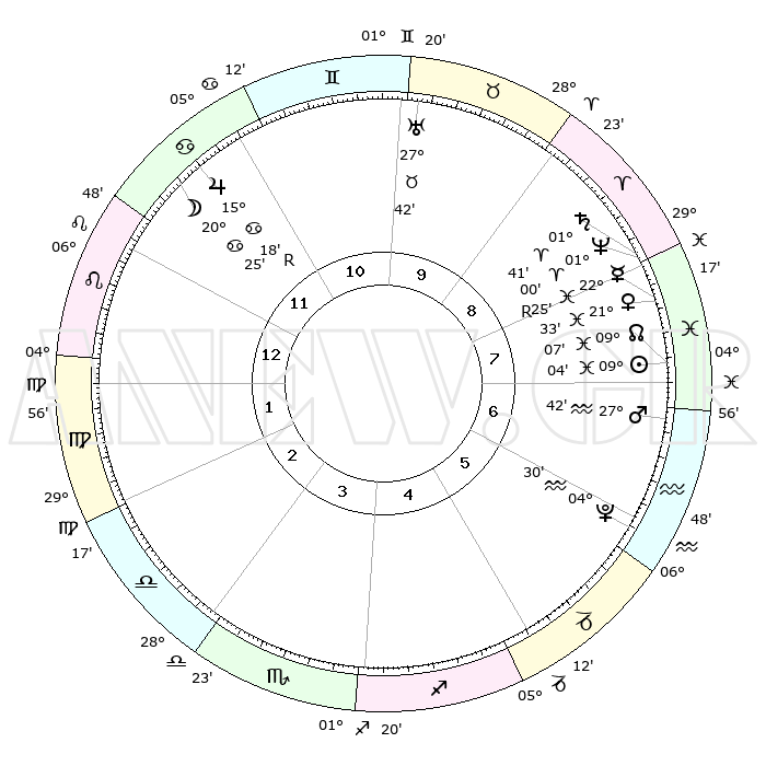 | | ΘΕΣΕΙΣ ΠΛΑΝΗΤΩΝ ΑΣΤΡΟΛΟΓΙΚΟΥ ΧΑΡΤΗ ΤΗΣ ΣΤΙΓΜΗΣ ΑΥΤΗΣ | | | | Πλανήτης | Ζώδιο | Μοίρες | Δεκαήμ. | Σε οίκο | Απόκλιση | | Ακμές των οίκων | | Ηλιος | Ιχθείς | 09°01' | Πρώτο | 7 | 08 S 11 | | 1ος | 18°35' | Λέων | | Σελήνη | Καρκίνος | 19°37' | Δεύτερο | 12 | 25 N 58 | | 2ος | 11°15' | Παρθένος | | Ερμής | Ιχθείς | 22°25'R | Τρίτο | 8 | 00 S 12 | | 3ος | 08°43' | Ζυγός | | Αφροδίτη | Ιχθείς | 21°29' | Τρίτο | 8 | 04 S 39 | | 4ος | 11°20' | Σκορπιός | | Αρης | Υδροχόος | 27°39' | Τρίτο | 7 | 13 S 19 | | 5ος | 16°21' | Τοξότης | | Δίας | Καρκίνος | 15°18'R | Δεύτερο | 11 | 22 N 54 | | 6ος | 19°24' | Αιγόκερως | | Κρόνος | Κριός | 01°40' | Πρώτο | 8 | 01 S 18 | | 7ος | 18°35' | Υδροχόος | | Ουρανός | Ταύρος | 27°42' | Τρίτο | 10 | 19 N 28 | | 8ος | 11°15' | Ιχθείς | | Ποσειδώνας | Κριός | 00°60' | Πρώτο | 8 | 00 S 48 | | 9ος | 08°43' | Κριός | | Πλούτωνας | Υδροχόος | 04°30' | Πρώτο | 6 | 22 S 53 | | 10ος | 11°20' | Ταύρος | | Β. Δεσμός | Ιχθείς | 09°07' | Πρώτο | 7 | 08 S 09 | | 11ος | 16°21' | Δίδυμοι | | Ωροσκόπος | Λέων | 18°35' | Δεύτερο | | | 12ος | 19°24' | Καρκίνος | | Μεσουράνημα | Ταύρος | 11°20' | Δεύτερο | | | |