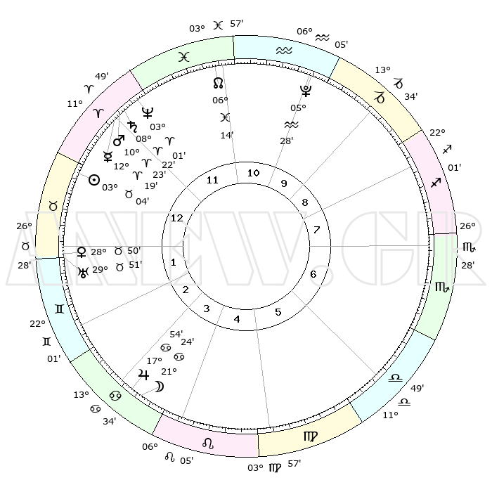 | | ΘΕΣΕΙΣ ΠΛΑΝΗΤΩΝ ΑΣΤΡΟΛΟΓΙΚΟΥ ΧΑΡΤΗ ΤΗΣ ΣΤΙΓΜΗΣ ΑΥΤΗΣ | | | | Πλανήτης | Ζώδιο | Μοίρες | Δεκαήμ. | Σε οίκο | Απόκλιση | | Ακμές των οίκων | | Ηλιος | Ταύρος | 02°60' | Πρώτο | 1 | 12 N 30 | | 1ος | 21°10' | Κριός | | Σελήνη | Καρκίνος | 20°25' | Τρίτο | 4 | 25 N 34 | | 2ος | 25°51' | Ταύρος | | Ερμής | Κριός | 12°12' | Δεύτερο | 12 | 02 N 29 | | 3ος | 20°23' | Δίδυμοι | | Αφροδίτη | Ταύρος | 28°45' | Τρίτο | 2 | 20 N 24 | | 4ος | 12°06' | Καρκίνος | | Αρης | Κριός | 10°20' | Δεύτερο | 12 | 03 N 14 | | 5ος | 05°42' | Λέων | | Δίας | Καρκίνος | 17°53' | Δεύτερο | 4 | 22 N 37 | | 6ος | 06°43' | Παρθένος | | Κρόνος | Κριός | 08°21' | Πρώτο | 12 | 01 N 20 | | 7ος | 21°10' | Ζυγός | | Ουρανός | Ταύρος | 29°51' | Τρίτο | 2 | 19 N 57 | | 8ος | 25°51' | Σκορπιός | | Ποσειδώνας | Κριός | 03°00' | Πρώτο | 12 | 00 S 01 | | 9ος | 20°23' | Τοξότης | | Πλούτωνας | Υδροχόος | 05°28' | Πρώτο | 10 | 22 S 48 | | 10ος | 12°06' | Αιγόκερως | | Β. Δεσμός | Ιχθείς | 06°14' | Πρώτο | 11 | 09 S 13 | | 11ος | 05°42' | Υδροχόος | | Ωροσκόπος | Κριός | 21°10' | Τρίτο | | | 12ος | 06°43' | Ιχθείς | | Μεσουράνημα | Αιγόκερως | 12°06' | Δεύτερο | | | |