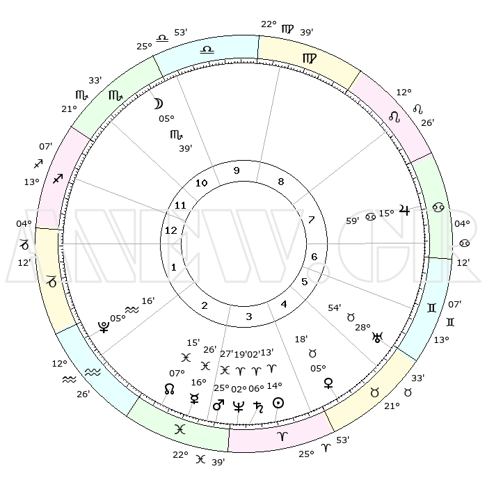 | | ΘΕΣΕΙΣ ΠΛΑΝΗΤΩΝ ΑΣΤΡΟΛΟΓΙΚΟΥ ΧΑΡΤΗ ΤΗΣ ΣΤΙΓΜΗΣ ΑΥΤΗΣ | | | | Πλανήτης | Ζώδιο | Μοίρες | Δεκαήμ. | Σε οίκο | Απόκλιση | | Ακμές των οίκων | | Ηλιος | Κριός | 14°09' | Δεύτερο | 4 | 05 N 35 | | 1ος | 15°28' | Τοξότης | | Σελήνη | Σκορπιός | 04°56' | Πρώτο | 11 | 17 S 13 | | 2ος | 19°15' | Αιγόκερως | | Ερμής | Ιχθείς | 16°23' | Δεύτερο | 3 | 06 S 58 | | 3ος | 27°32' | Υδροχόος | | Αφροδίτη | Ταύρος | 05°14' | Πρώτο | 5 | 12 N 57 | | 4ος | 03°13' | Κριός | | Αρης | Ιχθείς | 25°24' | Τρίτο | 3 | 02 S 47 | | 5ος | 01°56' | Ταύρος | | Δίας | Καρκίνος | 15°59' | Δεύτερο | 7 | 22 N 51 | | 6ος | 25°02' | Ταύρος | | Κρόνος | Κριός | 06°01' | Πρώτο | 4 | 00 N 26 | | 7ος | 15°28' | Δίδυμοι | | Ουρανός | Ταύρος | 28°54' | Τρίτο | 6 | 19 N 44 | | 8ος | 19°15' | Καρκίνος | | Ποσειδώνας | Κριός | 02°19' | Πρώτο | 3 | 00 S 17 | | 9ος | 27°32' | Λέων | | Πλούτωνας | Υδροχόος | 05°16' | Πρώτο | 2 | 22 S 47 | | 10ος | 03°13' | Ζυγός | | Β. Δεσμός | Ιχθείς | 07°15' | Πρώτο | 3 | 08 S 51 | | 11ος | 01°56' | Σκορπιός | | Ωροσκόπος | Τοξότης | 15°28' | Δεύτερο | | | 12ος | 25°02' | Σκορπιός | | Μεσουράνημα | Ζυγός | 03°13' | Πρώτο | | | |