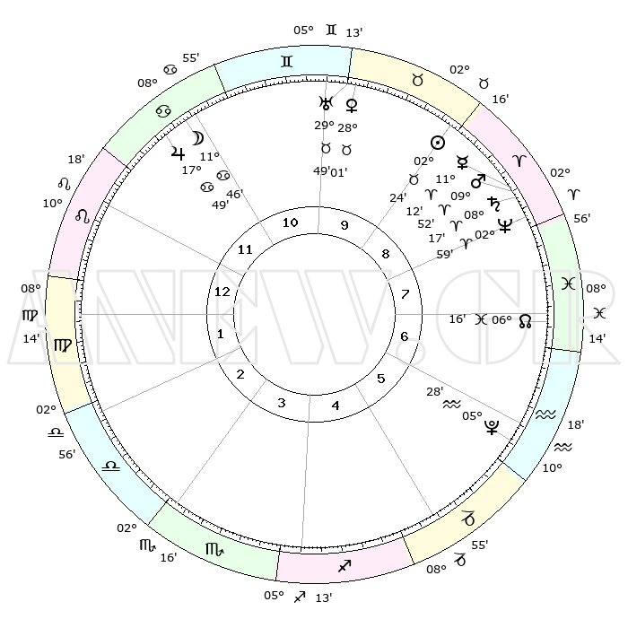 | | ΘΕΣΕΙΣ ΠΛΑΝΗΤΩΝ ΑΣΤΡΟΛΟΓΙΚΟΥ ΧΑΡΤΗ ΤΗΣ ΣΤΙΓΜΗΣ ΑΥΤΗΣ | | | | Πλανήτης | Ζώδιο | Μοίρες | Δεκαήμ. | Σε οίκο | Απόκλιση | | Ακμές των οίκων | | Ηλιος | Ταύρος | 02°21' | Πρώτο | 9 | 12 N 17 | | 1ος | 20°27' | Λέων | | Σελήνη | Καρκίνος | 10°54' | Δεύτερο | 11 | 27 N 14 | | 2ος | 13°19' | Παρθένος | | Ερμής | Κριός | 11°06' | Δεύτερο | 9 | 02 N 02 | | 3ος | 11°00' | Ζυγός | | Αφροδίτη | Ταύρος | 27°56' | Τρίτο | 10 | 20 N 12 | | 4ος | 13°42' | Σκορπιός | | Αρης | Κριός | 09°49' | Πρώτο | 8 | 03 N 01 | | 5ος | 18°34' | Τοξότης | | Δίας | Καρκίνος | 17°48' | Δεύτερο | 11 | 22 N 38 | | 6ος | 21°25' | Αιγόκερως | | Κρόνος | Κριός | 08°17' | Πρώτο | 8 | 01 N 18 | | 7ος | 20°27' | Υδροχόος | | Ουρανός | Ταύρος | 29°49' | Τρίτο | 10 | 19 N 57 | | 8ος | 13°19' | Ιχθείς | | Ποσειδώνας | Κριός | 02°59' | Πρώτο | 8 | 00 S 01 | | 9ος | 11°00' | Κριός | | Πλούτωνας | Υδροχόος | 05°28' | Πρώτο | 6 | 22 S 48 | | 10ος | 13°42' | Ταύρος | | Β. Δεσμός | Ιχθείς | 06°16' | Πρώτο | 7 | 09 S 13 | | 11ος | 18°34' | Δίδυμοι | | Ωροσκόπος | Λέων | 20°27' | Τρίτο | | | 12ος | 21°25' | Καρκίνος | | Μεσουράνημα | Ταύρος | 13°42' | Δεύτερο | | | |