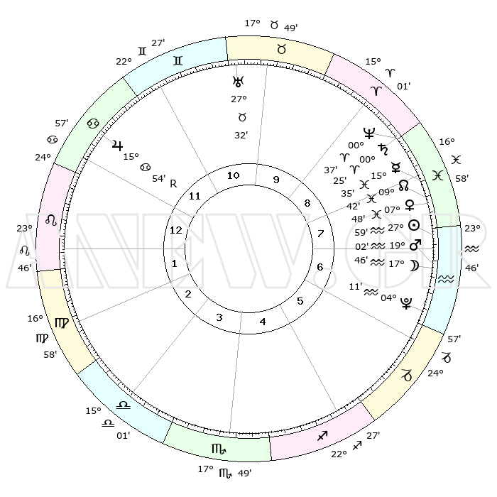 | | ΘΕΣΕΙΣ ΠΛΑΝΗΤΩΝ ΑΣΤΡΟΛΟΓΙΚΟΥ ΧΑΡΤΗ ΤΗΣ ΣΤΙΓΜΗΣ ΑΥΤΗΣ | | | | Πλανήτης | Ζώδιο | Μοίρες | Δεκαήμ. | Σε οίκο | Απόκλιση | | Ακμές των οίκων | | Ηλιος | Υδροχόος | 27°55' | Τρίτο | 7 | 12 S 12 | | 1ος | 06°40' | Λέων | | Σελήνη | Υδροχόος | 16°60' | Δεύτερο | 7 | 17 S 37 | | 2ος | 28°13' | Λέων | | Ερμής | Ιχθείς | 15°30' | Δεύτερο | 8 | 05 S 20 | | 3ος | 24°10' | Παρθένος | | Αφροδίτη | Ιχθείς | 07°44' | Πρώτο | 8 | 10 S 02 | | 4ος | 25°56' | Ζυγός | | Αρης | Υδροχόος | 18°59' | Δεύτερο | 7 | 16 S 09 | | 5ος | 01°44' | Τοξότης | | Δίας | Καρκίνος | 15°54'R | Δεύτερο | 12 | 22 N 49 | | 6ος | 06°22' | Αιγόκερως | | Κρόνος | Κριός | 00°24' | Πρώτο | 9 | 01 S 49 | | 7ος | 06°40' | Υδροχόος | | Ουρανός | Ταύρος | 27°32' | Τρίτο | 10 | 19 N 25 | | 8ος | 28°13' | Υδροχόος | | Ποσειδώνας | Κριός | 00°37' | Πρώτο | 9 | 00 S 57 | | 9ος | 24°10' | Ιχθείς | | Πλούτωνας | Υδροχόος | 04°11' | Πρώτο | 6 | 22 S 56 | | 10ος | 25°56' | Κριός | | Β. Δεσμός | Ιχθείς | 09°42' | Πρώτο | 8 | 07 S 56 | | 11ος | 01°44' | Δίδυμοι | | Ωροσκόπος | Λέων | 06°40' | Πρώτο | | | 12ος | 06°22' | Καρκίνος | | Μεσουράνημα | Κριός | 25°56' | Τρίτο | | | |