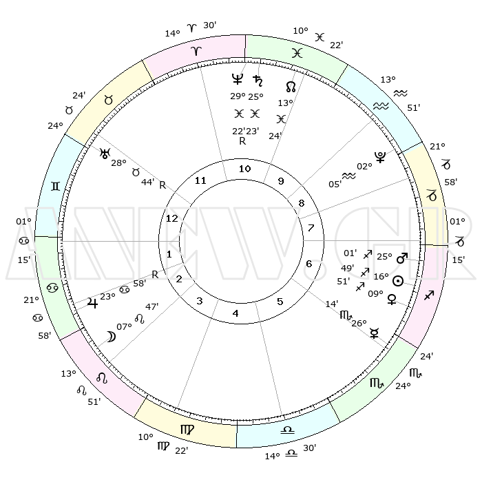 | | ΘΕΣΕΙΣ ΠΛΑΝΗΤΩΝ ΑΣΤΡΟΛΟΓΙΚΟΥ ΧΑΡΤΗ ΤΗΣ ΣΤΙΓΜΗΣ ΑΥΤΗΣ | | | | Πλανήτης | Ζώδιο | Μοίρες | Δεκαήμ. | Σε οίκο | Απόκλιση | | Ακμές των οίκων | | Ηλιος | Τοξότης | 16°47' | Δεύτερο | 6 | 22 S 47 | | 1ος | 19°21' | Δίδυμοι | | Σελήνη | Λέων | 07°18' | Πρώτο | 3 | 21 N 18 | | 2ος | 11°04' | Καρκίνος | | Ερμής | Σκορπιός | 26°12' | Τρίτο | 6 | 17 S 06 | | 3ος | 02°23' | Λέων | | Αφροδίτη | Τοξότης | 09°49' | Πρώτο | 6 | 21 S 30 | | 4ος | 27°08' | Λέων | | Αρης | Τοξότης | 24°59' | Τρίτο | 7 | 24 S 04 | | 5ος | 29°11' | Παρθένος | | Δίας | Καρκίνος | 23°58'R | Τρίτο | 2 | 21 N 29 | | 6ος | 09°28' | Σκορπιός | | Κρόνος | Ιχθείς | 25°23' | Τρίτο | 10 | 03 S 59 | | 7ος | 19°21' | Τοξότης | | Ουρανός | Ταύρος | 28°44'R | Τρίτο | 12 | 19 N 40 | | 8ος | 11°04' | Αιγόκερως | | Ποσειδώνας | Ιχθείς | 29°22'R | Τρίτο | 11 | 01 S 29 | | 9ος | 02°23' | Υδροχόος | | Πλούτωνας | Υδροχόος | 02°05' | Πρώτο | 8 | 23 S 22 | | 10ος | 27°08' | Υδροχόος | | Β. Δεσμός | Ιχθείς | 13°24' | Δεύτερο | 10 | 06 S 31 | | 11ος | 29°11' | Ιχθείς | | Ωροσκόπος | Δίδυμοι | 19°21' | Δεύτερο | | | 12ος | 09°28' | Ταύρος | | Μεσουράνημα | Υδροχόος | 27°08' | Τρίτο | | | |
