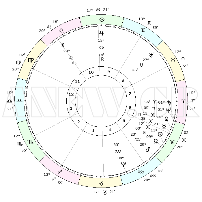| | ΘΕΣΕΙΣ ΠΛΑΝΗΤΩΝ ΑΣΤΡΟΛΟΓΙΚΟΥ ΧΑΡΤΗ ΤΗΣ ΣΤΙΓΜΗΣ ΑΥΤΗΣ | | | | Πλανήτης | Ζώδιο | Μοίρες | Δεκαήμ. | Σε οίκο | Απόκλιση | | Ακμές των οίκων | | Ηλιος | Ιχθείς | 11°09' | Δεύτερο | 6 | 07 S 23 | | 1ος | 29°11' | Παρθένος | | Σελήνη | Λέων | 19°18' | Δεύτερο | 11 | 16 N 43 | | 2ος | 25°43' | Ζυγός | | Ερμής | Ιχθείς | 21°37'R | Τρίτο | 6 | 00 S 12 | | 3ος | 26°07' | Σκορπιός | | Αφροδίτη | Ιχθείς | 24°09' | Τρίτο | 6 | 03 S 34 | | 4ος | 29°05' | Τοξότης | | Αρης | Υδροχόος | 29°20' | Τρίτο | 5 | 12 S 44 | | 5ος | 02°04' | Υδροχόος | | Δίας | Καρκίνος | 15°14'R | Δεύτερο | 10 | 22 N 54 | | 6ος | 02°32' | Ιχθείς | | Κρόνος | Κριός | 01°56' | Πρώτο | 7 | 01 S 11 | | 7ος | 29°11' | Ιχθείς | | Ουρανός | Ταύρος | 27°45' | Τρίτο | 9 | 19 N 29 | | 8ος | 25°43' | Κριός | | Ποσειδώνας | Κριός | 01°05' | Πρώτο | 7 | 00 S 46 | | 9ος | 26°07' | Ταύρος | | Πλούτωνας | Υδροχόος | 04°33' | Πρώτο | 5 | 22 S 52 | | 10ος | 29°05' | Δίδυμοι | | Β. Δεσμός | Ιχθείς | 09°00' | Πρώτο | 6 | 08 S 11 | | 11ος | 02°04' | Λέων | | Ωροσκόπος | Παρθένος | 29°11' | Τρίτο | | | 12ος | 02°32' | Παρθένος | | Μεσουράνημα | Δίδυμοι | 29°05' | Τρίτο | | | |