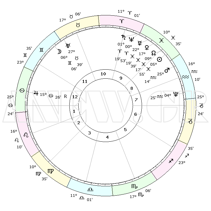 | | ΘΕΣΕΙΣ ΠΛΑΝΗΤΩΝ ΑΣΤΡΟΛΟΓΙΚΟΥ ΧΑΡΤΗ ΤΗΣ ΣΤΙΓΜΗΣ ΑΥΤΗΣ | | | | Πλανήτης | Ζώδιο | Μοίρες | Δεκαήμ. | Σε οίκο | Απόκλιση | | Ακμές των οίκων | | Ηλιος | Ιχθείς | 05°51' | Πρώτο | 9 | 09 S 22 | | 1ος | 03°40' | Καρκίνος | | Σελήνη | Δίδυμοι | 05°05' | Πρώτο | 12 | 26 N 19 | | 2ος | 24°16' | Καρκίνος | | Ερμής | Ιχθείς | 22°18' | Τρίτο | 10 | 00 S 53 | | 3ος | 16°20' | Λέων | | Αφροδίτη | Ιχθείς | 17°34' | Δεύτερο | 10 | 06 S 13 | | 4ος | 13°14' | Παρθένος | | Αρης | Υδροχόος | 25°11' | Τρίτο | 9 | 14 S 09 | | 5ος | 17°44' | Ζυγός | | Δίας | Καρκίνος | 15°26'R | Δεύτερο | 1 | 22 N 53 | | 6ος | 27°25' | Σκορπιός | | Κρόνος | Κριός | 01°18' | Πρώτο | 10 | 01 S 27 | | 7ος | 03°40' | Αιγόκερως | | Ουρανός | Ταύρος | 27°39' | Τρίτο | 12 | 19 N 27 | | 8ος | 24°16' | Αιγόκερως | | Ποσειδώνας | Κριός | 00°53' | Πρώτο | 10 | 00 S 51 | | 9ος | 16°20' | Υδροχόος | | Πλούτωνας | Υδροχόος | 04°25' | Πρώτο | 8 | 22 S 54 | | 10ος | 13°14' | Ιχθείς | | Β. Δεσμός | Ιχθείς | 09°17' | Πρώτο | 9 | 08 S 05 | | 11ος | 17°44' | Κριός | | Ωροσκόπος | Καρκίνος | 03°40' | Πρώτο | | | 12ος | 27°25' | Ταύρος | | Μεσουράνημα | Ιχθείς | 13°14' | Δεύτερο | | | |
