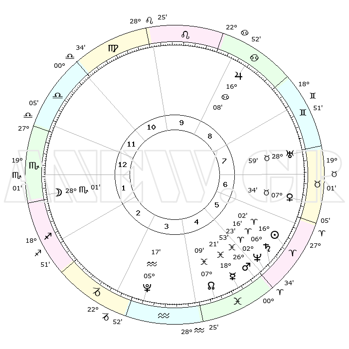 | | ΘΕΣΕΙΣ ΠΛΑΝΗΤΩΝ ΑΣΤΡΟΛΟΓΙΚΟΥ ΧΑΡΤΗ ΤΗΣ ΣΤΙΓΜΗΣ ΑΥΤΗΣ | | | | Πλανήτης | Ζώδιο | Μοίρες | Δεκαήμ. | Σε οίκο | Απόκλιση | | Ακμές των οίκων | | Ηλιος | Κριός | 15°58' | Δεύτερο | 6 | 06 N 17 | | 1ος | 28°41' | Ζυγός | | Σελήνη | Σκορπιός | 27°10' | Τρίτο | 2 | 24 S 27 | | 2ος | 27°01' | Σκορπιός | | Ερμής | Ιχθείς | 18°16' | Δεύτερο | 5 | 06 S 25 | | 3ος | 28°52' | Τοξότης | | Αφροδίτη | Ταύρος | 07°29' | Πρώτο | 7 | 13 N 47 | | 4ος | 02°58' | Υδροχόος | | Αρης | Ιχθείς | 26°50' | Τρίτο | 5 | 02 S 12 | | 5ος | 05°54' | Ιχθείς | | Δίας | Καρκίνος | 16°07' | Δεύτερο | 9 | 22 N 50 | | 6ος | 04°41' | Κριός | | Κρόνος | Κριός | 06°15' | Πρώτο | 6 | 00 N 31 | | 7ος | 28°41' | Κριός | | Ουρανός | Ταύρος | 28°59' | Τρίτο | 8 | 19 N 46 | | 8ος | 27°01' | Ταύρος | | Ποσειδώνας | Κριός | 02°23' | Πρώτο | 5 | 00 S 15 | | 9ος | 28°52' | Δίδυμοι | | Πλούτωνας | Υδροχόος | 05°17' | Πρώτο | 4 | 22 S 47 | | 10ος | 02°58' | Λέων | | Β. Δεσμός | Ιχθείς | 07°09' | Πρώτο | 5 | 08 S 53 | | 11ος | 05°54' | Παρθένος | | Ωροσκόπος | Ζυγός | 28°41' | Τρίτο | | | 12ος | 04°41' | Ζυγός | | Μεσουράνημα | Λέων | 02°58' | Πρώτο | | | |