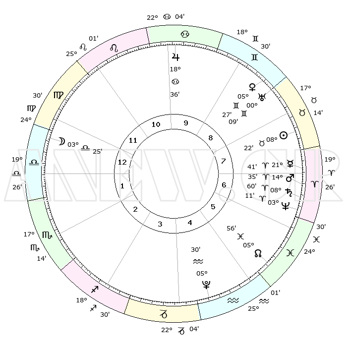 | | ΘΕΣΕΙΣ ΠΛΑΝΗΤΩΝ ΑΣΤΡΟΛΟΓΙΚΟΥ ΧΑΡΤΗ ΤΗΣ ΣΤΙΓΜΗΣ ΑΥΤΗΣ | | | | Πλανήτης | Ζώδιο | Μοίρες | Δεκαήμ. | Σε οίκο | Απόκλιση | | Ακμές των οίκων | | Ηλιος | Ταύρος | 08°19' | Πρώτο | 8 | 14 N 16 | | 1ος | 01°51' | Ζυγός | | Σελήνη | Ζυγός | 02°40' | Πρώτο | 1 | 03 S 04 | | 2ος | 28°35' | Ζυγός | | Ερμής | Κριός | 21°34' | Τρίτο | 7 | 06 N 24 | | 3ος | 29°05' | Σκορπιός | | Αφροδίτη | Δίδυμοι | 05°23' | Πρώτο | 9 | 21 N 58 | | 4ος | 02°05' | Αιγόκερως | | Αρης | Κριός | 14°32' | Δεύτερο | 7 | 04 N 54 | | 5ος | 05°03' | Υδροχόος | | Δίας | Καρκίνος | 18°35' | Δεύτερο | 10 | 22 N 32 | | 6ος | 05°24' | Ιχθείς | | Κρόνος | Κριός | 08°59' | Πρώτο | 7 | 01 N 34 | | 7ος | 01°51' | Κριός | | Ουρανός | Δίδυμοι | 00°09' | Πρώτο | 9 | 20 N 01 | | 8ος | 28°35' | Κριός | | Ποσειδώνας | Κριός | 03°11' | Πρώτο | 7 | 00 N 03 | | 9ος | 29°05' | Ταύρος | | Πλούτωνας | Υδροχόος | 05°30' | Πρώτο | 5 | 22 S 48 | | 10ος | 02°05' | Καρκίνος | | Β. Δεσμός | Ιχθείς | 05°57' | Πρώτο | 6 | 09 S 20 | | 11ος | 05°03' | Λέων | | Ωροσκόπος | Ζυγός | 01°51' | Πρώτο | | | 12ος | 05°24' | Παρθένος | | Μεσουράνημα | Καρκίνος | 02°05' | Πρώτο | | | |