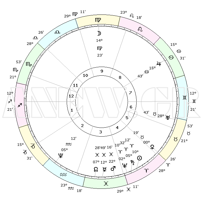 | | ΘΕΣΕΙΣ ΠΛΑΝΗΤΩΝ ΑΣΤΡΟΛΟΓΙΚΟΥ ΧΑΡΤΗ ΤΗΣ ΣΤΙΓΜΗΣ ΑΥΤΗΣ | | | | Πλανήτης | Ζώδιο | Μοίρες | Δεκαήμ. | Σε οίκο | Απόκλιση | | Ακμές των οίκων | | Ηλιος | Κριός | 10°08' | Δεύτερο | 5 | 04 N 01 | | 1ος | 22°19' | Σκορπιός | | Σελήνη | Παρθένος | 13°29' | Δεύτερο | 10 | 06 N 05 | | 2ος | 22°30' | Τοξότης | | Ερμής | Ιχθείς | 12°46' | Δεύτερο | 4 | 07 S 48 | | 3ος | 26°59' | Αιγόκερως | | Αφροδίτη | Ταύρος | 00°14' | Πρώτο | 5 | 11 N 05 | | 4ος | 02°44' | Ιχθείς | | Αρης | Ιχθείς | 22°13' | Τρίτο | 4 | 04 S 03 | | 5ος | 04°36' | Κριός | | Δίας | Καρκίνος | 15°42' | Δεύτερο | 8 | 22 N 53 | | 6ος | 00°41' | Ταύρος | | Κρόνος | Κριός | 05°31' | Πρώτο | 5 | 00 N 14 | | 7ος | 22°19' | Ταύρος | | Ουρανός | Ταύρος | 28°43' | Τρίτο | 7 | 19 N 42 | | 8ος | 22°30' | Δίδυμοι | | Ποσειδώνας | Κριός | 02°10' | Πρώτο | 4 | 00 S 20 | | 9ος | 26°59' | Καρκίνος | | Πλούτωνας | Υδροχόος | 05°12' | Πρώτο | 3 | 22 S 47 | | 10ος | 02°44' | Παρθένος | | Β. Δεσμός | Ιχθείς | 07°28' | Πρώτο | 4 | 08 S 46 | | 11ος | 04°36' | Ζυγός | | Ωροσκόπος | Σκορπιός | 22°19' | Τρίτο | | | 12ος | 00°41' | Σκορπιός | | Μεσουράνημα | Παρθένος | 02°44' | Πρώτο | | | |