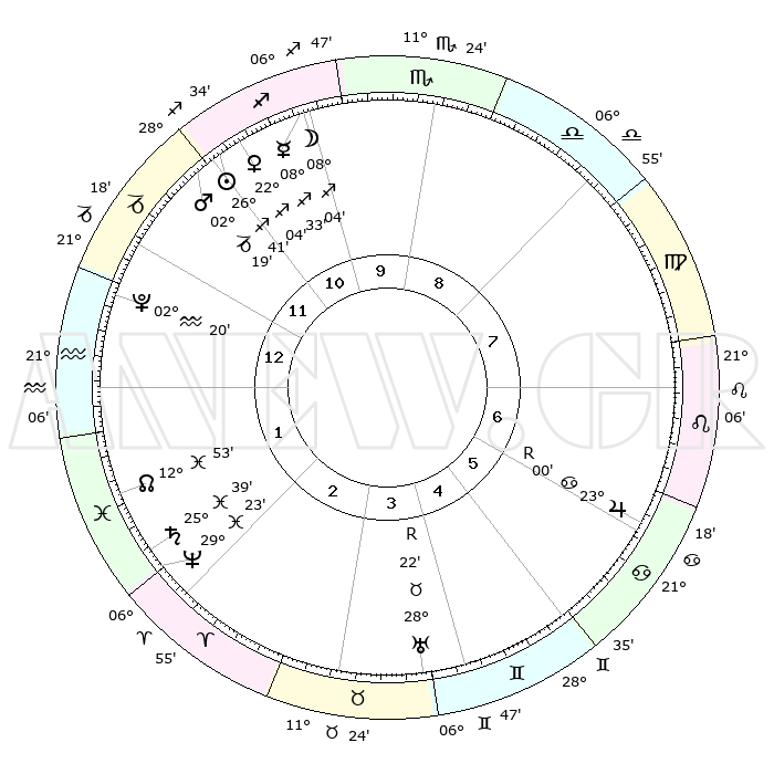 | | ΘΕΣΕΙΣ ΠΛΑΝΗΤΩΝ ΑΣΤΡΟΛΟΓΙΚΟΥ ΧΑΡΤΗ ΤΗΣ ΣΤΙΓΜΗΣ ΑΥΤΗΣ | | | | Πλανήτης | Ζώδιο | Μοίρες | Δεκαήμ. | Σε οίκο | Απόκλιση | | Ακμές των οίκων | | Ηλιος | Τοξότης | 26°18' | Τρίτο | 3 | 23 S 23 | | 1ος | 12°42' | Ζυγός | | Σελήνη | Τοξότης | 03°28' | Πρώτο | 2 | 25 S 41 | | 2ος | 10°07' | Σκορπιός | | Ερμής | Τοξότης | 08°01' | Πρώτο | 2 | 20 S 30 | | 3ος | 11°03' | Τοξότης | | Αφροδίτη | Τοξότης | 21°35' | Τρίτο | 3 | 23 S 07 | | 4ος | 14°20' | Αιγόκερως | | Αρης | Αιγόκερως | 02°02' | Πρώτο | 3 | 24 S 13 | | 5ος | 17°16' | Υδροχόος | | Δίας | Καρκίνος | 23°03'R | Τρίτο | 10 | 21 N 40 | | 6ος | 17°09' | Ιχθείς | | Κρόνος | Ιχθείς | 25°38' | Τρίτο | 6 | 03 S 51 | | 7ος | 12°42' | Κριός | | Ουρανός | Ταύρος | 28°23'R | Τρίτο | 8 | 19 N 36 | | 8ος | 10°07' | Ταύρος | | Ποσειδώνας | Ιχθείς | 29°23' | Τρίτο | 6 | 01 S 28 | | 9ος | 11°03' | Δίδυμοι | | Πλούτωνας | Υδροχόος | 02°19' | Πρώτο | 4 | 23 S 18 | | 10ος | 14°20' | Καρκίνος | | Β. Δεσμός | Ιχθείς | 12°55' | Δεύτερο | 5 | 06 S 43 | | 11ος | 17°16' | Λέων | | Ωροσκόπος | Ζυγός | 12°42' | Δεύτερο | | | 12ος | 17°09' | Παρθένος | | Μεσουράνημα | Καρκίνος | 14°20' | Δεύτερο | | | |