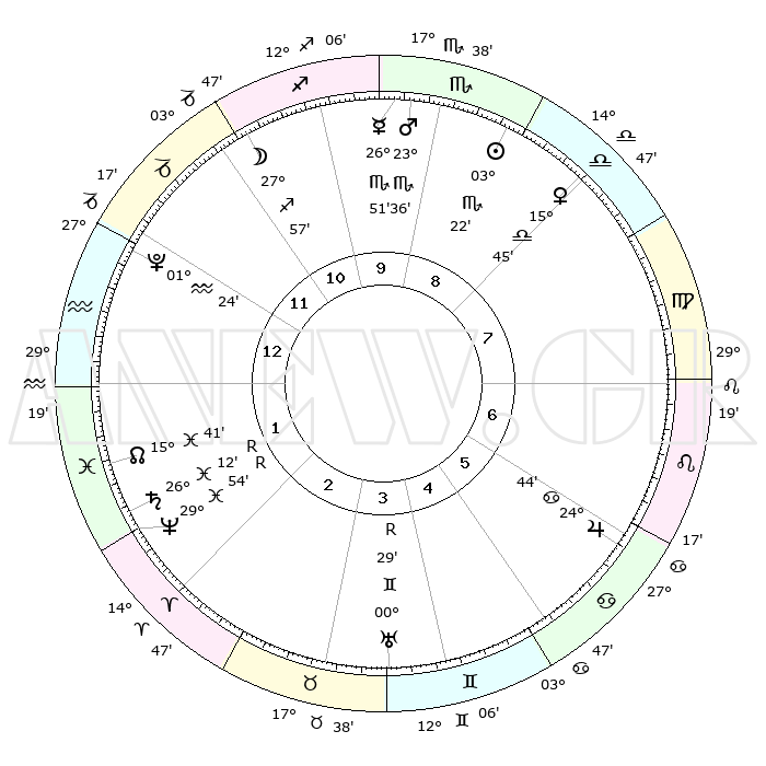 | | ΘΕΣΕΙΣ ΠΛΑΝΗΤΩΝ ΑΣΤΡΟΛΟΓΙΚΟΥ ΧΑΡΤΗ ΤΗΣ ΣΤΙΓΜΗΣ ΑΥΤΗΣ | | | | Πλανήτης | Ζώδιο | Μοίρες | Δεκαήμ. | Σε οίκο | Απόκλιση | | Ακμές των οίκων | | Ηλιος | Σκορπιός | 03°15' | Πρώτο | 9 | 12 S 36 | | 1ος | 11°30' | Αιγόκερως | | Σελήνη | Τοξότης | 26°39' | Τρίτο | 12 | 28 S 27 | | 2ος | 21°35' | Υδροχόος | | Ερμής | Σκορπιός | 26°43' | Τρίτο | 10 | 22 S 03 | | 3ος | 01°50' | Κριός | | Αφροδίτη | Ζυγός | 15°37' | Δεύτερο | 9 | 04 S 44 | | 4ος | 03°44' | Ταύρος | | Αρης | Σκορπιός | 23°31' | Τρίτο | 10 | 18 S 59 | | 5ος | 28°23' | Ταύρος | | Δίας | Καρκίνος | 24°43' | Τρίτο | 7 | 21 N 15 | | 6ος | 19°40' | Δίδυμοι | | Κρόνος | Ιχθείς | 26°12'R | Τρίτο | 2 | 03 S 47 | | 7ος | 11°30' | Καρκίνος | | Ουρανός | Δίδυμοι | 00°29'R | Πρώτο | 5 | 20 N 02 | | 8ος | 21°35' | Λέων | | Ποσειδώνας | Ιχθείς | 29°54'R | Τρίτο | 2 | 01 S 18 | | 9ος | 01°50' | Ζυγός | | Πλούτωνας | Υδροχόος | 01°24' | Πρώτο | 1 | 23 S 31 | | 10ος | 03°44' | Σκορπιός | | Β. Δεσμός | Ιχθείς | 15°42' | Δεύτερο | 2 | 05 S 38 | | 11ος | 28°23' | Σκορπιός | | Ωροσκόπος | Αιγόκερως | 11°30' | Δεύτερο | | | 12ος | 19°41' | Τοξότης | | Μεσουράνημα | Σκορπιός | 03°44' | Πρώτο | | | |