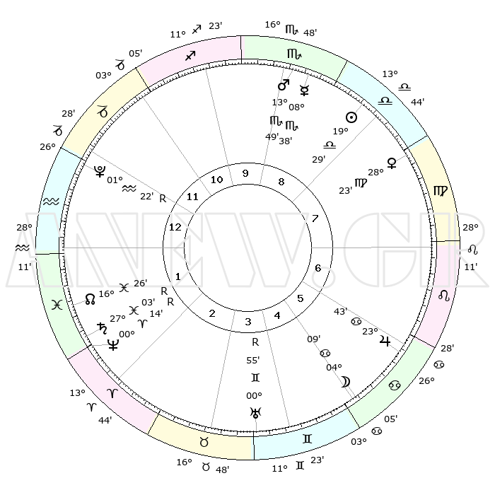 | ΘΕΣΕΙΣ ΠΛΑΝΗΤΩΝ ΑΣΤΡΟΛΟΓΙΚΟΥ ΧΑΡΤΗ ΤΗΣ ΣΤΙΓΜΗΣ ΑΥΤΗΣ | | Πλανήτης | Ζώδιο | Μοίρες | Δεκαήμ. | Σε οίκο | Απόκλιση | | Ακμές των οίκων | Ηλιος | Ζυγός | 19°23' | Δεύτερο | 9 | 07 S 35 | | 1ος | 12°29' | Αιγόκερως | Σελήνη | Καρκίνος | 02°41' | Πρώτο | 6 | 28 N 27 | | 2ος | 22°50' | Υδροχόος | Ερμής | Σκορπιός | 08°29' | Πρώτο | 10 | 15 S 42 | | 3ος | 03°03' | Κριός | Αφροδίτη | Παρθένος | 28°15' | Τρίτο | 8 | 02 N 04 | | 4ος | 04°46' | Ταύρος | Αρης | Σκορπιός | 13°45' | Δεύτερο | 10 | 16 S 09 | | 5ος | 29°17' | Ταύρος | Δίας | Καρκίνος | 23°42' | Τρίτο | 7 | 21 N 24 | | 6ος | 20°33' | Δίδυμοι | Κρόνος | Ιχθείς | 27°03'R | Τρίτο | 2 | 03 S 28 | | 7ος | 12°29' | Καρκίνος | Ουρανός | Δίδυμοι | 00°56'R | Πρώτο | 5 | 20 N 08 | | 8ος | 22°50' | Λέων | Ποσειδώνας | Κριός | 00°14'R | Πρώτο | 2 | 01 S 10 | | 9ος | 03°03' | Ζυγός | Πλούτωνας | Υδροχόος | 01°22'R | Πρώτο | 1 | 23 S 32 | | 10ος | 04°46' | Σκορπιός | Β. Δεσμός | Ιχθείς | 16°26' | Δεύτερο | 2 | 05 S 21 | | 11ος | 29°17' | Σκορπιός | Ωροσκόπος | Αιγόκερως | 12°29' | Δεύτερο | | | 12ος | 20°33' | Τοξότης | Μεσουράνημα | Σκορπιός | 04°46' | Πρώτο | | | |