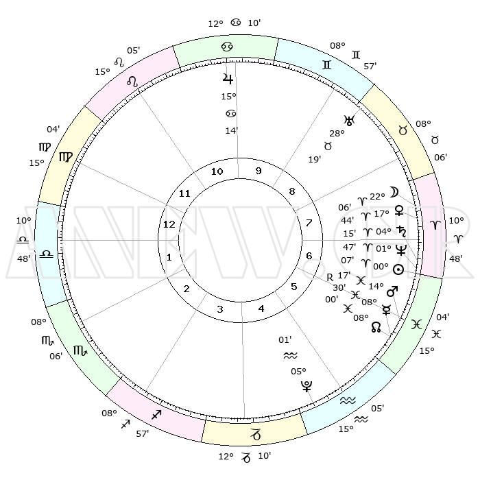 | | ΘΕΣΕΙΣ ΠΛΑΝΗΤΩΝ ΑΣΤΡΟΛΟΓΙΚΟΥ ΧΑΡΤΗ ΤΗΣ ΣΤΙΓΜΗΣ ΑΥΤΗΣ | | | | Πλανήτης | Ζώδιο | Μοίρες | Δεκαήμ. | Σε οίκο | Απόκλιση | | Ακμές των οίκων | | Ηλιος | Κριός | 00°02' | Πρώτο | 7 | 00 N 01 | | 1ος | 16°51' | Παρθένος | | Σελήνη | Κριός | 20°56' | Τρίτο | 8 | 11 N 26 | | 2ος | 12°22' | Ζυγός | | Ερμής | Ιχθείς | 08°30'R | Πρώτο | 6 | 07 S 26 | | 3ος | 12°13' | Σκορπιός | | Αφροδίτη | Κριός | 17°38' | Δεύτερο | 8 | 06 N 07 | | 4ος | 15°09' | Τοξότης | | Αρης | Ιχθείς | 14°13' | Δεύτερο | 6 | 07 S 12 | | 5ος | 18°27' | Αιγόκερως | | Δίας | Καρκίνος | 15°14' | Δεύτερο | 10 | 22 N 55 | | 6ος | 19°24' | Υδροχόος | | Κρόνος | Κριός | 04°15' | Πρώτο | 7 | 00 S 16 | | 7ος | 16°51' | Ιχθείς | | Ουρανός | Ταύρος | 28°18' | Τρίτο | 9 | 19 N 36 | | 8ος | 12°22' | Κριός | | Ποσειδώνας | Κριός | 01°47' | Πρώτο | 7 | 00 S 29 | | 9ος | 12°13' | Ταύρος | | Πλούτωνας | Υδροχόος | 05°00' | Πρώτο | 5 | 22 S 49 | | 10ος | 15°09' | Δίδυμοι | | Β. Δεσμός | Ιχθείς | 08°00' | Πρώτο | 6 | 08 S 34 | | 11ος | 18°27' | Καρκίνος | | Ωροσκόπος | Παρθένος | 16°51' | Δεύτερο | | | 12ος | 19°24' | Λέων | | Μεσουράνημα | Δίδυμοι | 15°09' | Δεύτερο | | | |