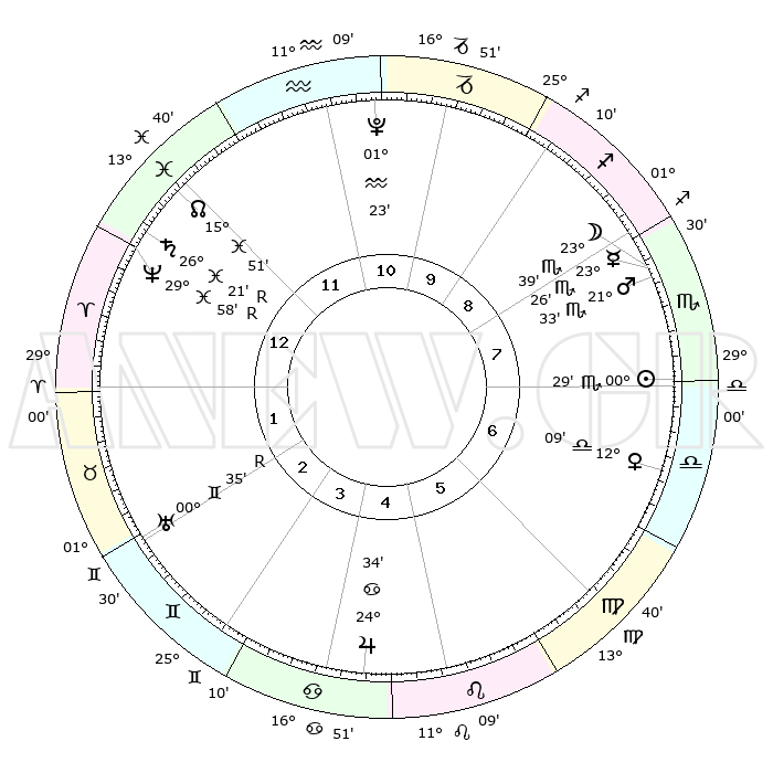 | ΘΕΣΕΙΣ ΠΛΑΝΗΤΩΝ ΑΣΤΡΟΛΟΓΙΚΟΥ ΧΑΡΤΗ ΤΗΣ ΣΤΙΓΜΗΣ ΑΥΤΗΣ | | Πλανήτης | Ζώδιο | Μοίρες | Δεκαήμ. | Σε οίκο | Απόκλιση | | Ακμές των οίκων | Ηλιος | Σκορπιός | 00°20' | Πρώτο | 9 | 11 S 35 | | 1ος | 07°21' | Υδροχόος | Σελήνη | Σκορπιός | 21°54' | Τρίτο | 9 | 22 S 42 | | 2ος | 22°28' | Ιχθείς | Ερμής | Σκορπιός | 23°15' | Τρίτο | 9 | 21 S 01 | | 3ος | 29°39' | Κριός | Αφροδίτη | Ζυγός | 11°58' | Δεύτερο | 8 | 03 S 19 | | 4ος | 26°55' | Ταύρος | Αρης | Σκορπιός | 21°27' | Τρίτο | 9 | 18 S 25 | | 5ος | 19°12' | Δίδυμοι | Δίας | Καρκίνος | 24°33' | Τρίτο | 6 | 21 N 16 | | 6ος | 10°57' | Καρκίνος | Κρόνος | Ιχθείς | 26°22'R | Τρίτο | 2 | 03 S 44 | | 7ος | 07°21' | Λέων | Ουρανός | Δίδυμοι | 00°35'R | Πρώτο | 4 | 20 N 04 | | 8ος | 22°28' | Παρθένος | Ποσειδώνας | Ιχθείς | 29°58'R | Τρίτο | 2 | 01 S 16 | | 9ος | 29°39' | Ζυγός | Πλούτωνας | Υδροχόος | 01°23' | Πρώτο | 12 | 23 S 32 | | 10ος | 26°55' | Σκορπιός | Β. Δεσμός | Ιχθείς | 15°51' | Δεύτερο | 1 | 05 S 35 | | 11ος | 19°12' | Τοξότης | Ωροσκόπος | Υδροχόος | 07°21' | Πρώτο | | | 12ος | 10°57' | Αιγόκερως | Μεσουράνημα | Σκορπιός | 26°55' | Τρίτο | | | |