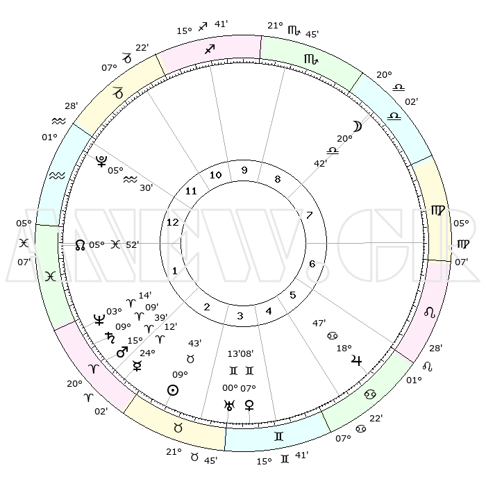 | | ΘΕΣΕΙΣ ΠΛΑΝΗΤΩΝ ΑΣΤΡΟΛΟΓΙΚΟΥ ΧΑΡΤΗ ΤΗΣ ΣΤΙΓΜΗΣ ΑΥΤΗΣ | | | | Πλανήτης | Ζώδιο | Μοίρες | Δεκαήμ. | Σε οίκο | Απόκλιση | | Ακμές των οίκων | | Ηλιος | Ταύρος | 09°40' | Πρώτο | 3 | 14 N 42 | | 1ος | 09°18' | Υδροχόος | | Σελήνη | Ζυγός | 20°04' | Τρίτο | 8 | 11 S 02 | | 2ος | 24°36' | Ιχθείς | | Ερμής | Κριός | 24°06' | Τρίτο | 2 | 07 N 28 | | 3ος | 01°26' | Ταύρος | | Αφροδίτη | Δίδυμοι | 07°04' | Πρώτο | 4 | 22 N 20 | | 4ος | 28°24' | Ταύρος | | Αρης | Κριός | 15°36' | Δεύτερο | 2 | 05 N 19 | | 5ος | 20°35' | Δίδυμοι | | Δίας | Καρκίνος | 18°47' | Δεύτερο | 6 | 22 N 30 | | 6ος | 12°27' | Καρκίνος | | Κρόνος | Κριός | 09°09' | Πρώτο | 2 | 01 N 38 | | 7ος | 09°18' | Λέων | | Ουρανός | Δίδυμοι | 00°13' | Πρώτο | 4 | 20 N 02 | | 8ος | 24°36' | Παρθένος | | Ποσειδώνας | Κριός | 03°14' | Πρώτο | 2 | 00 N 04 | | 9ος | 01°26' | Σκορπιός | | Πλούτωνας | Υδροχόος | 05°30' | Πρώτο | 12 | 22 S 49 | | 10ος | 28°24' | Σκορπιός | | Β. Δεσμός | Ιχθείς | 05°52' | Πρώτο | 1 | 09 S 21 | | 11ος | 20°35' | Τοξότης | | Ωροσκόπος | Υδροχόος | 09°18' | Πρώτο | | | 12ος | 12°27' | Αιγόκερως | | Μεσουράνημα | Σκορπιός | 28°24' | Τρίτο | | | |