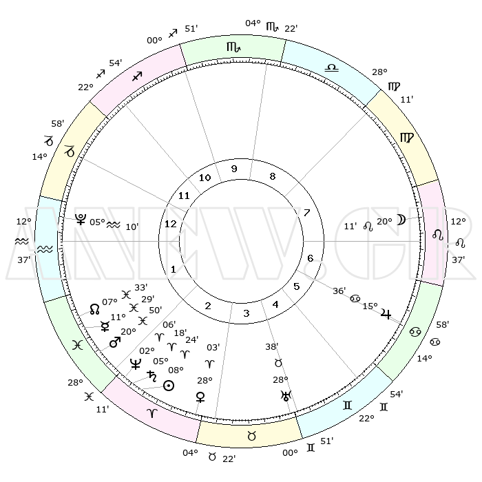 | | ΘΕΣΕΙΣ ΠΛΑΝΗΤΩΝ ΑΣΤΡΟΛΟΓΙΚΟΥ ΧΑΡΤΗ ΤΗΣ ΣΤΙΓΜΗΣ ΑΥΤΗΣ | | | | Πλανήτης | Ζώδιο | Μοίρες | Δεκαήμ. | Σε οίκο | Απόκλιση | | Ακμές των οίκων | | Ηλιος | Κριός | 08°20' | Πρώτο | 2 | 03 N 18 | | 1ος | 18°20' | Αιγόκερως | | Σελήνη | Λέων | 19°25' | Δεύτερο | 7 | 16 N 38 | | 2ος | 00°05' | Ιχθείς | | Ερμής | Ιχθείς | 11°26' | Δεύτερο | 2 | 08 S 01 | | 3ος | 09°58' | Κριός | | Αφροδίτη | Κριός | 27°59' | Τρίτο | 3 | 10 N 14 | | 4ος | 10°34' | Ταύρος | | Αρης | Ιχθείς | 20°48' | Τρίτο | 2 | 04 S 37 | | 5ος | 04°23' | Δίδυμοι | | Δίας | Καρκίνος | 15°36' | Δεύτερο | 6 | 22 N 53 | | 6ος | 25°36' | Δίδυμοι | | Κρόνος | Κριός | 05°17' | Πρώτο | 2 | 00 N 09 | | 7ος | 18°20' | Καρκίνος | | Ουρανός | Ταύρος | 28°38' | Τρίτο | 4 | 19 N 41 | | 8ος | 00°05' | Παρθένος | | Ποσειδώνας | Κριός | 02°06' | Πρώτο | 2 | 00 S 22 | | 9ος | 09°58' | Ζυγός | | Πλούτωνας | Υδροχόος | 05°10' | Πρώτο | 1 | 22 S 48 | | 10ος | 10°34' | Σκορπιός | | Β. Δεσμός | Ιχθείς | 07°34' | Πρώτο | 2 | 08 S 44 | | 11ος | 04°23' | Τοξότης | | Ωροσκόπος | Αιγόκερως | 18°20' | Δεύτερο | | | 12ος | 25°36' | Τοξότης | | Μεσουράνημα | Σκορπιός | 10°34' | Δεύτερο | | | |