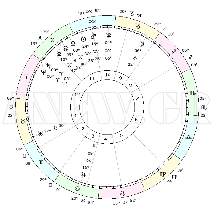 | | ΘΕΣΕΙΣ ΠΛΑΝΗΤΩΝ ΑΣΤΡΟΛΟΓΙΚΟΥ ΧΑΡΤΗ ΤΗΣ ΣΤΙΓΜΗΣ ΑΥΤΗΣ | | | | Πλανήτης | Ζώδιο | Μοίρες | Δεκαήμ. | Σε οίκο | Απόκλιση | | Ακμές των οίκων | | Ηλιος | Υδροχόος | 24°34' | Τρίτο | 12 | 13 S 20 | | 1ος | 21°04' | Ιχθείς | | Σελήνη | Αιγόκερως | 05°25' | Πρώτο | 10 | 28 S 02 | | 2ος | 03°22' | Ταύρος | | Ερμής | Ιχθείς | 10°39' | Δεύτερο | 12 | 07 S 52 | | 3ος | 02°13' | Δίδυμοι | | Αφροδίτη | Ιχθείς | 03°34' | Πρώτο | 12 | 11 S 34 | | 4ος | 24°58' | Δίδυμοι | | Αρης | Υδροχόος | 16°22' | Δεύτερο | 12 | 16 S 57 | | 5ος | 16°57' | Καρκίνος | | Δίας | Καρκίνος | 16°10'R | Δεύτερο | 4 | 22 N 47 | | 6ος | 13°03' | Λέων | | Κρόνος | Κριός | 00°02' | Πρώτο | 1 | 01 S 58 | | 7ος | 21°04' | Παρθένος | | Ουρανός | Ταύρος | 27°30' | Τρίτο | 2 | 19 N 25 | | 8ος | 03°22' | Σκορπιός | | Ποσειδώνας | Κριός | 00°31' | Πρώτο | 1 | 01 S 00 | | 9ος | 02°13' | Τοξότης | | Πλούτωνας | Υδροχόος | 04°05' | Πρώτο | 11 | 22 S 57 | | 10ος | 24°58' | Τοξότης | | Β. Δεσμός | Ιχθείς | 09°53' | Πρώτο | 12 | 07 S 52 | | 11ος | 16°57' | Αιγόκερως | | Ωροσκόπος | Ιχθείς | 21°04' | Τρίτο | | | 12ος | 13°03' | Υδροχόος | | Μεσουράνημα | Τοξότης | 24°58' | Τρίτο | | | |