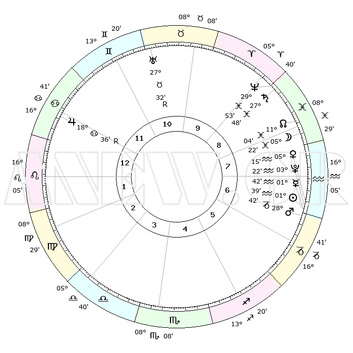 | | ΘΕΣΕΙΣ ΠΛΑΝΗΤΩΝ ΑΣΤΡΟΛΟΓΙΚΟΥ ΧΑΡΤΗ ΤΗΣ ΣΤΙΓΜΗΣ ΑΥΤΗΣ | | | | Πλανήτης | Ζώδιο | Μοίρες | Δεκαήμ. | Σε οίκο | Απόκλιση | | Ακμές των οίκων | | Ηλιος | Υδροχόος | 01°35' | Πρώτο | 7 | 19 S 48 | | 1ος | 25°15' | Καρκίνος | | Σελήνη | Ιχθείς | 04°26' | Πρώτο | 8 | 10 S 18 | | 2ος | 16°01' | Λέων | | Ερμής | Υδροχόος | 01°34' | Πρώτο | 7 | 21 S 48 | | 3ος | 10°26' | Παρθένος | | Αφροδίτη | Υδροχόος | 05°10' | Πρώτο | 7 | 20 S 06 | | 4ος | 10°50' | Ζυγός | | Αρης | Αιγόκερως | 28°38' | Τρίτο | 7 | 21 S 24 | | 5ος | 16°55' | Σκορπιός | | Δίας | Καρκίνος | 18°36'R | Δεύτερο | 12 | 22 N 25 | | 6ος | 23°25' | Τοξότης | | Κρόνος | Ιχθείς | 27°48' | Τρίτο | 9 | 02 S 54 | | 7ος | 25°15' | Αιγόκερως | | Ουρανός | Ταύρος | 27°32'R | Τρίτο | 11 | 19 N 25 | | 8ος | 16°01' | Υδροχόος | | Ποσειδώνας | Ιχθείς | 29°53' | Τρίτο | 9 | 01 S 16 | | 9ος | 10°26' | Ιχθείς | | Πλούτωνας | Υδροχόος | 03°22' | Πρώτο | 7 | 23 S 05 | | 10ος | 10°50' | Κριός | | Β. Δεσμός | Ιχθείς | 11°05' | Δεύτερο | 9 | 07 S 25 | | 11ος | 16°55' | Ταύρος | | Ωροσκόπος | Καρκίνος | 25°15' | Τρίτο | | | 12ος | 23°25' | Δίδυμοι | | Μεσουράνημα | Κριός | 10°50' | Δεύτερο | | | |