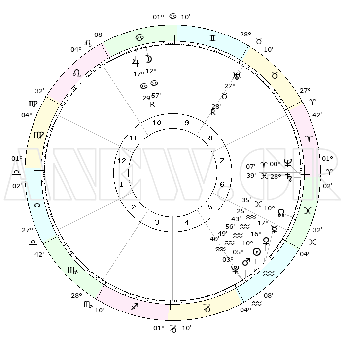 | | ΘΕΣΕΙΣ ΠΛΑΝΗΤΩΝ ΑΣΤΡΟΛΟΓΙΚΟΥ ΧΑΡΤΗ ΤΗΣ ΣΤΙΓΜΗΣ ΑΥΤΗΣ | | | | Πλανήτης | Ζώδιο | Μοίρες | Δεκαήμ. | Σε οίκο | Απόκλιση | | Ακμές των οίκων | | Ηλιος | Υδροχόος | 10°53' | Δεύτερο | 5 | 17 S 30 | | 1ος | 14°28' | Παρθένος | | Σελήνη | Καρκίνος | 12°08' | Δεύτερο | 10 | 27 N 14 | | 2ος | 09°46' | Ζυγός | | Ερμής | Υδροχόος | 17°19' | Δεύτερο | 6 | 17 S 30 | | 3ος | 09°30' | Σκορπιός | | Αφροδίτη | Υδροχόος | 16°39' | Δεύτερο | 5 | 17 S 07 | | 4ος | 12°26' | Τοξότης | | Αρης | Υδροχόος | 05°47' | Πρώτο | 5 | 19 S 50 | | 5ος | 15°49' | Αιγόκερως | | Δίας | Καρκίνος | 17°30'R | Δεύτερο | 11 | 22 N 35 | | 6ος | 16°53' | Υδροχόος | | Κρόνος | Ιχθείς | 28°38' | Τρίτο | 7 | 02 S 32 | | 7ος | 14°28' | Ιχθείς | | Ουρανός | Ταύρος | 27°28'R | Τρίτο | 9 | 19 N 24 | | 8ος | 09°46' | Κριός | | Ποσειδώνας | Κριός | 00°07' | Πρώτο | 7 | 01 S 10 | | 9ος | 09°30' | Ταύρος | | Πλούτωνας | Υδροχόος | 03°40' | Πρώτο | 5 | 23 S 02 | | 10ος | 12°26' | Δίδυμοι | | Β. Δεσμός | Ιχθείς | 10°36' | Δεύτερο | 6 | 07 S 36 | | 11ος | 15°49' | Καρκίνος | | Ωροσκόπος | Παρθένος | 14°28' | Δεύτερο | | | 12ος | 16°53' | Λέων | | Μεσουράνημα | Δίδυμοι | 12°26' | Δεύτερο | | | |