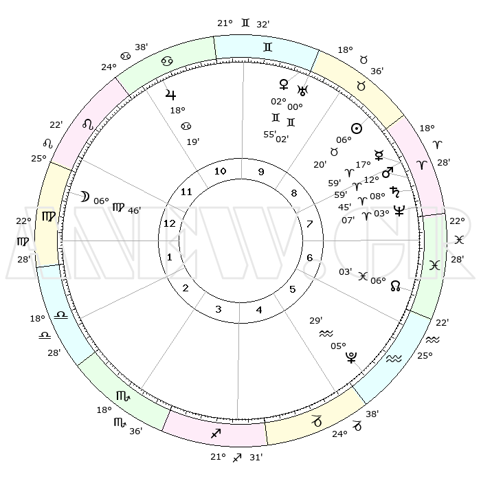 | | ΘΕΣΕΙΣ ΠΛΑΝΗΤΩΝ ΑΣΤΡΟΛΟΓΙΚΟΥ ΧΑΡΤΗ ΤΗΣ ΣΤΙΓΜΗΣ ΑΥΤΗΣ | | | | Πλανήτης | Ζώδιο | Μοίρες | Δεκαήμ. | Σε οίκο | Απόκλιση | | Ακμές των οίκων | | Ηλιος | Ταύρος | 06°17' | Πρώτο | 9 | 13 N 37 | | 1ος | 04°32' | Παρθένος | | Σελήνη | Παρθένος | 05°58' | Πρώτο | 1 | 09 N 26 | | 2ος | 28°51' | Παρθένος | | Ερμής | Κριός | 17°53' | Δεύτερο | 8 | 04 N 51 | | 3ος | 27°55' | Ζυγός | | Αφροδίτη | Δίδυμοι | 02°51' | Πρώτο | 10 | 21 N 24 | | 4ος | 00°52' | Τοξότης | | Αρης | Κριός | 12°56' | Δεύτερο | 8 | 04 N 16 | | 5ος | 04°45' | Αιγόκερως | | Δίας | Καρκίνος | 18°19' | Δεύτερο | 11 | 22 N 34 | | 6ος | 06°23' | Υδροχόος | | Κρόνος | Κριός | 08°45' | Πρώτο | 8 | 01 N 29 | | 7ος | 04°32' | Ιχθείς | | Ουρανός | Δίδυμοι | 00°02' | Πρώτο | 9 | 19 N 59 | | 8ος | 28°51' | Ιχθείς | | Ποσειδώνας | Κριός | 03°07' | Πρώτο | 8 | 00 N 02 | | 9ος | 27°55' | Κριός | | Πλούτωνας | Υδροχόος | 05°29' | Πρώτο | 5 | 22 S 48 | | 10ος | 00°52' | Δίδυμοι | | Β. Δεσμός | Ιχθείς | 06°03' | Πρώτο | 7 | 09 S 17 | | 11ος | 04°45' | Καρκίνος | | Ωροσκόπος | Παρθένος | 04°32' | Πρώτο | | | 12ος | 06°23' | Λέων | | Μεσουράνημα | Δίδυμοι | 00°52' | Πρώτο | | | |