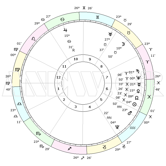 | | ΘΕΣΕΙΣ ΠΛΑΝΗΤΩΝ ΑΣΤΡΟΛΟΓΙΚΟΥ ΧΑΡΤΗ ΤΗΣ ΣΤΙΓΜΗΣ ΑΥΤΗΣ | | | | Πλανήτης | Ζώδιο | Μοίρες | Δεκαήμ. | Σε οίκο | Απόκλιση | | Ακμές των οίκων | | Ηλιος | Ιχθείς | 04°03' | Πρώτο | 6 | 10 S 01 | | 1ος | 04°35' | Παρθένος | | Σελήνη | Ταύρος | 09°45' | Πρώτο | 9 | 19 N 06 | | 2ος | 28°55' | Παρθένος | | Ερμής | Ιχθείς | 21°30' | Τρίτο | 7 | 01 S 35 | | 3ος | 27°59' | Ζυγός | | Αφροδίτη | Ιχθείς | 15°20' | Δεύτερο | 7 | 07 S 06 | | 4ος | 00°56' | Τοξότης | | Αρης | Υδροχόος | 23°46' | Τρίτο | 6 | 14 S 37 | | 5ος | 04°49' | Αιγόκερως | | Δίας | Καρκίνος | 15°32'R | Δεύτερο | 11 | 22 N 52 | | 6ος | 06°27' | Υδροχόος | | Κρόνος | Κριός | 01°06' | Πρώτο | 8 | 01 S 32 | | 7ος | 04°35' | Ιχθείς | | Ουρανός | Ταύρος | 27°37' | Τρίτο | 9 | 19 N 27 | | 8ος | 28°55' | Ιχθείς | | Ποσειδώνας | Κριός | 00°50' | Πρώτο | 8 | 00 S 52 | | 9ος | 27°59' | Κριός | | Πλούτωνας | Υδροχόος | 04°22' | Πρώτο | 5 | 22 S 54 | | 10ος | 00°56' | Δίδυμοι | | Β. Δεσμός | Ιχθείς | 09°23' | Πρώτο | 7 | 08 S 03 | | 11ος | 04°50' | Καρκίνος | | Ωροσκόπος | Παρθένος | 04°35' | Πρώτο | | | 12ος | 06°27' | Λέων | | Μεσουράνημα | Δίδυμοι | 00°56' | Πρώτο | | | |