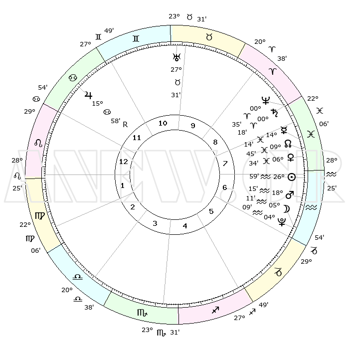 | | ΘΕΣΕΙΣ ΠΛΑΝΗΤΩΝ ΑΣΤΡΟΛΟΓΙΚΟΥ ΧΑΡΤΗ ΤΗΣ ΣΤΙΓΜΗΣ ΑΥΤΗΣ | | | | Πλανήτης | Ζώδιο | Μοίρες | Δεκαήμ. | Σε οίκο | Απόκλιση | | Ακμές των οίκων | | Ηλιος | Υδροχόος | 26°55' | Τρίτο | 7 | 12 S 32 | | 1ος | 09°54' | Λέων | | Σελήνη | Υδροχόος | 04°22' | Πρώτο | 6 | 22 S 04 | | 2ος | 01°44' | Παρθένος | | Ερμής | Ιχθείς | 14°09' | Δεύτερο | 8 | 06 S 04 | | 3ος | 28°07' | Παρθένος | | Αφροδίτη | Ιχθείς | 06°30' | Πρώτο | 8 | 10 S 29 | | 4ος | 00°10' | Σκορπιός | | Αρης | Υδροχόος | 18°12' | Δεύτερο | 7 | 16 S 24 | | 5ος | 05°47' | Τοξότης | | Δίας | Καρκίνος | 15°59'R | Δεύτερο | 12 | 22 N 48 | | 6ος | 09°57' | Αιγόκερως | | Κρόνος | Κριός | 00°18' | Πρώτο | 9 | 01 S 51 | | 7ος | 09°54' | Υδροχόος | | Ουρανός | Ταύρος | 27°31' | Τρίτο | 10 | 19 N 25 | | 8ος | 01°44' | Ιχθείς | | Ποσειδώνας | Κριός | 00°35' | Πρώτο | 9 | 00 S 58 | | 9ος | 28°07' | Ιχθείς | | Πλούτωνας | Υδροχόος | 04°09' | Πρώτο | 6 | 22 S 56 | | 10ος | 00°10' | Ταύρος | | Β. Δεσμός | Ιχθείς | 09°45' | Πρώτο | 8 | 07 S 55 | | 11ος | 05°47' | Δίδυμοι | | Ωροσκόπος | Λέων | 09°54' | Πρώτο | | | 12ος | 09°57' | Καρκίνος | | Μεσουράνημα | Ταύρος | 00°10' | Πρώτο | | | |