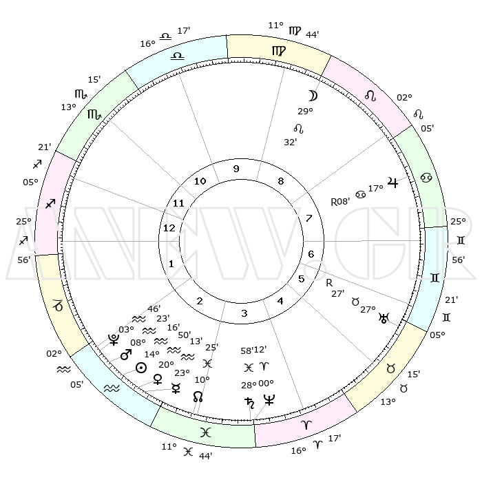 | | ΘΕΣΕΙΣ ΠΛΑΝΗΤΩΝ ΑΣΤΡΟΛΟΓΙΚΟΥ ΧΑΡΤΗ ΤΗΣ ΣΤΙΓΜΗΣ ΑΥΤΗΣ | | | | Πλανήτης | Ζώδιο | Μοίρες | Δεκαήμ. | Σε οίκο | Απόκλιση | | Ακμές των οίκων | | Ηλιος | Υδροχόος | 14°12' | Δεύτερο | 2 | 16 S 34 | | 1ος | 07°44' | Τοξότης | | Σελήνη | Λέων | 28°43' | Τρίτο | 9 | 12 N 48 | | 2ος | 10°04' | Αιγόκερως | | Ερμής | Υδροχόος | 23°07' | Τρίτο | 3 | 15 S 27 | | 3ος | 17°05' | Υδροχόος | | Αφροδίτη | Υδροχόος | 20°45' | Τρίτο | 3 | 15 S 53 | | 4ος | 23°08' | Ιχθείς | | Αρης | Υδροχόος | 08°20' | Πρώτο | 2 | 19 S 11 | | 5ος | 23°06' | Κριός | | Δίας | Καρκίνος | 17°08'R | Δεύτερο | 8 | 22 N 38 | | 6ος | 17°07' | Ταύρος | | Κρόνος | Ιχθείς | 28°58' | Τρίτο | 4 | 02 S 24 | | 7ος | 07°44' | Δίδυμοι | | Ουρανός | Ταύρος | 27°27'R | Τρίτο | 6 | 19 N 24 | | 8ος | 10°04' | Καρκίνος | | Ποσειδώνας | Κριός | 00°12' | Πρώτο | 4 | 01 S 08 | | 9ος | 17°05' | Λέων | | Πλούτωνας | Υδροχόος | 03°46' | Πρώτο | 2 | 23 S 01 | | 10ος | 23°08' | Παρθένος | | Β. Δεσμός | Ιχθείς | 10°25' | Δεύτερο | 3 | 07 S 40 | | 11ος | 23°06' | Ζυγός | | Ωροσκόπος | Τοξότης | 07°44' | Πρώτο | | | 12ος | 17°07' | Σκορπιός | | Μεσουράνημα | Παρθένος | 23°08' | Τρίτο | | | |