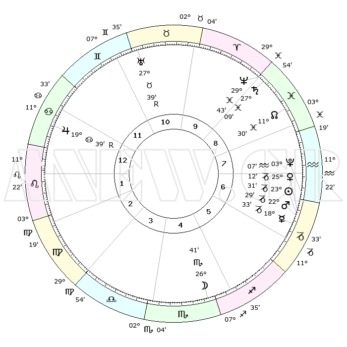 | | ΘΕΣΕΙΣ ΠΛΑΝΗΤΩΝ ΑΣΤΡΟΛΟΓΙΚΟΥ ΧΑΡΤΗ ΤΗΣ ΣΤΙΓΜΗΣ ΑΥΤΗΣ | | | | Πλανήτης | Ζώδιο | Μοίρες | Δεκαήμ. | Σε οίκο | Απόκλιση | | Ακμές των οίκων | | Ηλιος | Αιγόκερως | 23°27' | Τρίτο | 7 | 21 S 24 | | 1ος | 23°06' | Καρκίνος | | Σελήνη | Σκορπιός | 25°57' | Τρίτο | 5 | 24 S 04 | | 2ος | 13°46' | Λέων | | Ερμής | Αιγόκερως | 18°27' | Δεύτερο | 6 | 23 S 51 | | 3ος | 07°54' | Παρθένος | | Αφροδίτη | Αιγόκερως | 25°07' | Τρίτο | 7 | 22 S 02 | | 4ος | 07°59' | Ζυγός | | Αρης | Αιγόκερως | 22°26' | Τρίτο | 6 | 22 S 31 | | 5ος | 14°03' | Σκορπιός | | Δίας | Καρκίνος | 19°40'R | Δεύτερο | 12 | 22 N 15 | | 6ος | 20°55' | Τοξότης | | Κρόνος | Ιχθείς | 27°08' | Τρίτο | 9 | 03 S 11 | | 7ος | 23°06' | Αιγόκερως | | Ουρανός | Ταύρος | 27°39'R | Τρίτο | 11 | 19 N 27 | | 8ος | 13°46' | Υδροχόος | | Ποσειδώνας | Ιχθείς | 29°43' | Τρίτο | 9 | 01 S 20 | | 9ος | 07°54' | Ιχθείς | | Πλούτωνας | Υδροχόος | 03°07' | Πρώτο | 7 | 23 S 08 | | 10ος | 07°59' | Κριός | | Β. Δεσμός | Ιχθείς | 11°30' | Δεύτερο | 9 | 07 S 15 | | 11ος | 14°03' | Ταύρος | | Ωροσκόπος | Καρκίνος | 23°06' | Τρίτο | | | 12ος | 20°55' | Δίδυμοι | | Μεσουράνημα | Κριός | 07°59' | Πρώτο | | | |