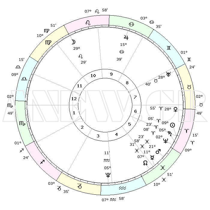 | | ΘΕΣΕΙΣ ΠΛΑΝΗΤΩΝ ΑΣΤΡΟΛΟΓΙΚΟΥ ΧΑΡΤΗ ΤΗΣ ΣΤΙΓΜΗΣ ΑΥΤΗΣ | | | | Πλανήτης | Ζώδιο | Μοίρες | Δεκαήμ. | Σε οίκο | Απόκλιση | | Ακμές των οίκων | | Ηλιος | Κριός | 09°02' | Πρώτο | 6 | 03 N 35 | | 1ος | 17°12' | Ζυγός | | Σελήνη | Λέων | 28°47' | Τρίτο | 11 | 12 N 45 | | 2ος | 14°53' | Σκορπιός | | Ερμής | Ιχθείς | 11°56' | Δεύτερο | 5 | 07 S 57 | | 3ος | 16°02' | Τοξότης | | Αφροδίτη | Κριός | 28°51' | Τρίτο | 7 | 10 N 34 | | 4ος | 19°29' | Αιγόκερως | | Αρης | Ιχθείς | 21°21' | Τρίτο | 5 | 04 S 24 | | 5ος | 22°26' | Υδροχόος | | Δίας | Καρκίνος | 15°38' | Δεύτερο | 9 | 22 N 53 | | 6ος | 22°03' | Ιχθείς | | Κρόνος | Κριός | 05°23' | Πρώτο | 6 | 00 N 11 | | 7ος | 17°12' | Κριός | | Ουρανός | Ταύρος | 28°40' | Τρίτο | 8 | 19 N 41 | | 8ος | 14°53' | Ταύρος | | Ποσειδώνας | Κριός | 02°07' | Πρώτο | 6 | 00 S 21 | | 9ος | 16°02' | Δίδυμοι | | Πλούτωνας | Υδροχόος | 05°11' | Πρώτο | 4 | 22 S 48 | | 10ος | 19°29' | Καρκίνος | | Β. Δεσμός | Ιχθείς | 07°31' | Πρώτο | 5 | 08 S 45 | | 11ος | 22°26' | Λέων | | Ωροσκόπος | Ζυγός | 17°12' | Δεύτερο | | | 12ος | 22°03' | Παρθένος | | Μεσουράνημα | Καρκίνος | 19°29' | Δεύτερο | | | |