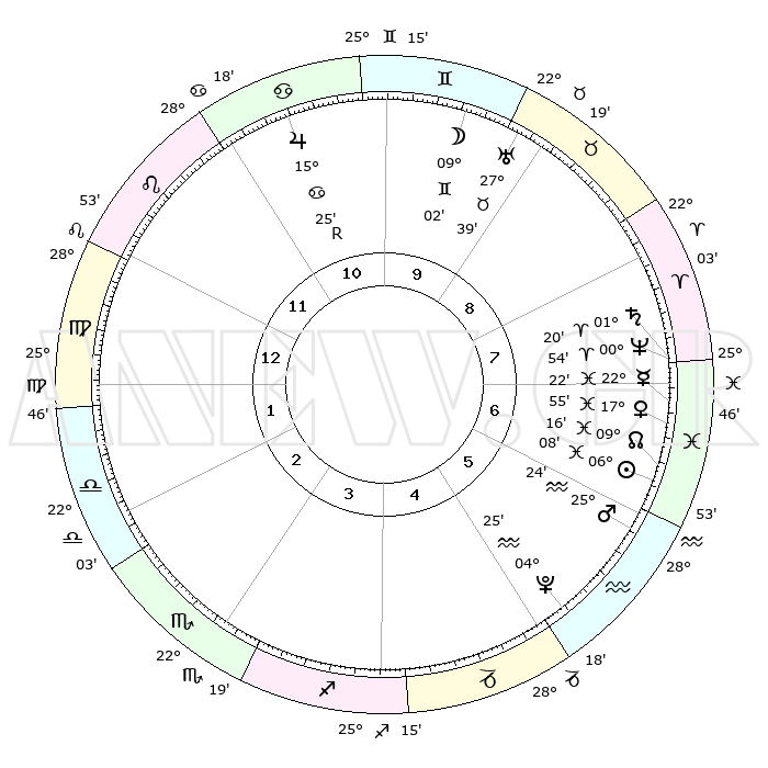 | | ΘΕΣΕΙΣ ΠΛΑΝΗΤΩΝ ΑΣΤΡΟΛΟΓΙΚΟΥ ΧΑΡΤΗ ΤΗΣ ΣΤΙΓΜΗΣ ΑΥΤΗΣ | | | | Πλανήτης | Ζώδιο | Μοίρες | Δεκαήμ. | Σε οίκο | Απόκλιση | | Ακμές των οίκων | | Ηλιος | Ιχθείς | 06°04' | Πρώτο | 7 | 09 S 17 | | 1ος | 05°47' | Παρθένος | | Σελήνη | Δίδυμοι | 08°04' | Πρώτο | 10 | 26 N 51 | | 2ος | 00°14' | Ζυγός | | Ερμής | Ιχθείς | 22°21' | Τρίτο | 7 | 00 S 48 | | 3ος | 29°23' | Ζυγός | | Αφροδίτη | Ιχθείς | 17°50' | Δεύτερο | 7 | 06 S 07 | | 4ος | 02°20' | Τοξότης | | Αρης | Υδροχόος | 25°21' | Τρίτο | 6 | 14 S 06 | | 5ος | 06°10' | Αιγόκερως | | Δίας | Καρκίνος | 15°26'R | Δεύτερο | 11 | 22 N 53 | | 6ος | 07°42' | Υδροχόος | | Κρόνος | Κριός | 01°20' | Πρώτο | 8 | 01 S 26 | | 7ος | 05°47' | Ιχθείς | | Ουρανός | Ταύρος | 27°39' | Τρίτο | 9 | 19 N 27 | | 8ος | 00°14' | Κριός | | Ποσειδώνας | Κριός | 00°54' | Πρώτο | 8 | 00 S 51 | | 9ος | 29°23' | Κριός | | Πλούτωνας | Υδροχόος | 04°25' | Πρώτο | 5 | 22 S 54 | | 10ος | 02°20' | Δίδυμοι | | Β. Δεσμός | Ιχθείς | 09°16' | Πρώτο | 7 | 08 S 05 | | 11ος | 06°10' | Καρκίνος | | Ωροσκόπος | Παρθένος | 05°47' | Πρώτο | | | 12ος | 07°42' | Λέων | | Μεσουράνημα | Δίδυμοι | 02°20' | Πρώτο | | | |