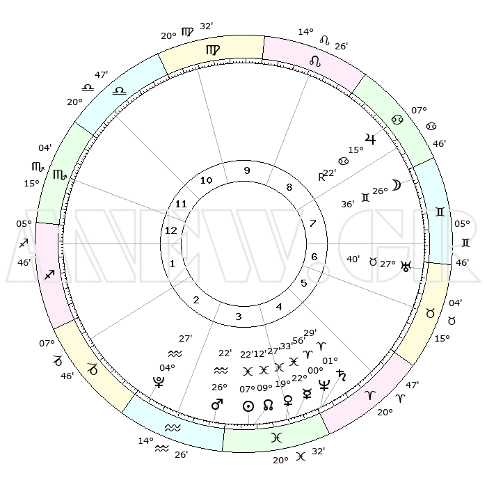 | | ΘΕΣΕΙΣ ΠΛΑΝΗΤΩΝ ΑΣΤΡΟΛΟΓΙΚΟΥ ΧΑΡΤΗ ΤΗΣ ΣΤΙΓΜΗΣ ΑΥΤΗΣ | | | | Πλανήτης | Ζώδιο | Μοίρες | Δεκαήμ. | Σε οίκο | Απόκλιση | | Ακμές των οίκων | | Ηλιος | Ιχθείς | 07°19' | Πρώτο | 4 | 08 S 49 | | 1ος | 18°45' | Σκορπιός | | Σελήνη | Δίδυμοι | 25°47' | Τρίτο | 8 | 28 N 25 | | 2ος | 18°34' | Τοξότης | | Ερμής | Ιχθείς | 22°33' | Τρίτο | 4 | 00 S 28 | | 3ος | 22°32' | Αιγόκερως | | Αφροδίτη | Ιχθείς | 19°23' | Δεύτερο | 4 | 05 S 29 | | 4ος | 28°04' | Υδροχόος | | Αρης | Υδροχόος | 26°19' | Τρίτο | 3 | 13 S 46 | | 5ος | 00°14' | Κριός | | Δίας | Καρκίνος | 15°22'R | Δεύτερο | 8 | 22 N 53 | | 6ος | 26°48' | Κριός | | Κρόνος | Κριός | 01°28' | Πρώτο | 5 | 01 S 22 | | 7ος | 18°45' | Ταύρος | | Ουρανός | Ταύρος | 27°40' | Τρίτο | 7 | 19 N 28 | | 8ος | 18°34' | Δίδυμοι | | Ποσειδώνας | Κριός | 00°56' | Πρώτο | 5 | 00 S 50 | | 9ος | 22°32' | Καρκίνος | | Πλούτωνας | Υδροχόος | 04°27' | Πρώτο | 3 | 22 S 53 | | 10ος | 28°04' | Λέων | | Β. Δεσμός | Ιχθείς | 09°12' | Πρώτο | 4 | 08 S 07 | | 11ος | 00°14' | Ζυγός | | Ωροσκόπος | Σκορπιός | 18°45' | Δεύτερο | | | 12ος | 26°48' | Ζυγός | | Μεσουράνημα | Λέων | 28°04' | Τρίτο | | | |
