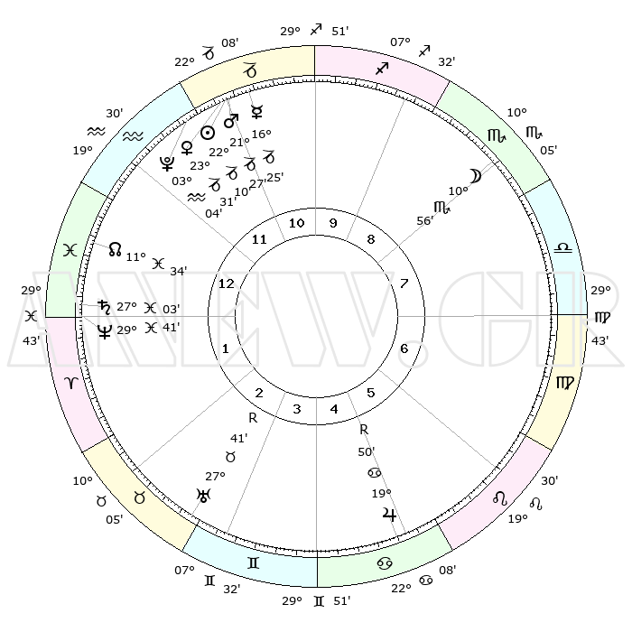 | | ΘΕΣΕΙΣ ΠΛΑΝΗΤΩΝ ΑΣΤΡΟΛΟΓΙΚΟΥ ΧΑΡΤΗ ΤΗΣ ΣΤΙΓΜΗΣ ΑΥΤΗΣ | | | | Πλανήτης | Ζώδιο | Μοίρες | Δεκαήμ. | Σε οίκο | Απόκλιση | | Ακμές των οίκων | | Ηλιος | Αιγόκερως | 22°06' | Τρίτο | 11 | 21 S 37 | | 1ος | 22°16' | Υδροχόος | | Σελήνη | Σκορπιός | 10°09' | Δεύτερο | 8 | 19 S 04 | | 2ος | 08°04' | Κριός | | Ερμής | Αιγόκερως | 16°18' | Δεύτερο | 11 | 24 S 02 | | 3ος | 12°20' | Ταύρος | | Αφροδίτη | Αιγόκερως | 23°26' | Τρίτο | 12 | 22 S 17 | | 4ος | 07°34' | Δίδυμοι | | Αρης | Αιγόκερως | 21°24' | Τρίτο | 11 | 22 S 41 | | 5ος | 29°20' | Δίδυμοι | | Δίας | Καρκίνος | 19°50'R | Δεύτερο | 5 | 22 N 14 | | 6ος | 22°09' | Καρκίνος | | Κρόνος | Ιχθείς | 27°02' | Τρίτο | 1 | 03 S 13 | | 7ος | 22°16' | Λέων | | Ουρανός | Ταύρος | 27°41'R | Τρίτο | 3 | 19 N 27 | | 8ος | 08°04' | Ζυγός | | Ποσειδώνας | Ιχθείς | 29°41' | Τρίτο | 1 | 01 S 21 | | 9ος | 12°20' | Σκορπιός | | Πλούτωνας | Υδροχόος | 03°04' | Πρώτο | 12 | 23 S 09 | | 10ος | 07°34' | Τοξότης | | Β. Δεσμός | Ιχθείς | 11°34' | Δεύτερο | 1 | 07 S 13 | | 11ος | 29°20' | Τοξότης | | Ωροσκόπος | Υδροχόος | 22°16' | Τρίτο | | | 12ος | 22°09' | Αιγόκερως | | Μεσουράνημα | Τοξότης | 07°34' | Πρώτο | | | |