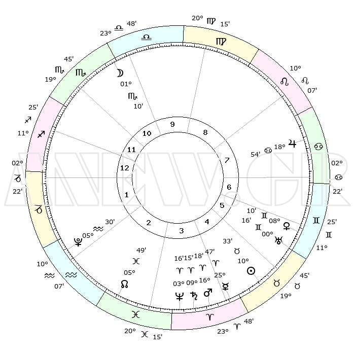 | | ΘΕΣΕΙΣ ΠΛΑΝΗΤΩΝ ΑΣΤΡΟΛΟΓΙΚΟΥ ΧΑΡΤΗ ΤΗΣ ΣΤΙΓΜΗΣ ΑΥΤΗΣ | | | | Πλανήτης | Ζώδιο | Μοίρες | Δεκαήμ. | Σε οίκο | Απόκλιση | | Ακμές των οίκων | | Ηλιος | Ταύρος | 10°30' | Δεύτερο | 5 | 14 N 58 | | 1ος | 17°51' | Τοξότης | | Σελήνη | Σκορπιός | 00°37' | Πρώτο | 10 | 15 S 30 | | 2ος | 22°08' | Αιγόκερως | | Ερμής | Κριός | 25°42' | Τρίτο | 4 | 08 N 07 | | 3ος | 00°46' | Ιχθείς | | Αφροδίτη | Δίδυμοι | 08°06' | Πρώτο | 6 | 22 N 32 | | 4ος | 06°15' | Κριός | | Αρης | Κριός | 16°16' | Δεύτερο | 4 | 05 N 34 | | 5ος | 04°35' | Ταύρος | | Δίας | Καρκίνος | 18°54' | Δεύτερο | 7 | 22 N 29 | | 6ος | 27°26' | Ταύρος | | Κρόνος | Κριός | 09°15' | Πρώτο | 4 | 01 N 40 | | 7ος | 17°51' | Δίδυμοι | | Ουρανός | Δίδυμοι | 00°16' | Πρώτο | 6 | 20 N 02 | | 8ος | 22°08' | Καρκίνος | | Ποσειδώνας | Κριός | 03°16' | Πρώτο | 3 | 00 N 05 | | 9ος | 00°46' | Παρθένος | | Πλούτωνας | Υδροχόος | 05°30' | Πρώτο | 2 | 22 S 49 | | 10ος | 06°15' | Ζυγός | | Β. Δεσμός | Ιχθείς | 05°49' | Πρώτο | 3 | 09 S 22 | | 11ος | 04°35' | Σκορπιός | | Ωροσκόπος | Τοξότης | 17°51' | Δεύτερο | | | 12ος | 27°26' | Σκορπιός | | Μεσουράνημα | Ζυγός | 06°15' | Πρώτο | | | |
