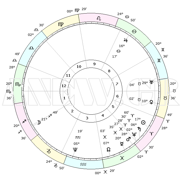 | | ΘΕΣΕΙΣ ΠΛΑΝΗΤΩΝ ΑΣΤΡΟΛΟΓΙΚΟΥ ΧΑΡΤΗ ΤΗΣ ΣΤΙΓΜΗΣ ΑΥΤΗΣ | | | | Πλανήτης | Ζώδιο | Μοίρες | Δεκαήμ. | Σε οίκο | Απόκλιση | | Ακμές των οίκων | | Ηλιος | Κριός | 17°56' | Δεύτερο | 6 | 07 N 02 | | 1ος | 00°04' | Σκορπιός | | Σελήνη | Τοξότης | 20°59' | Τρίτο | 2 | 28 S 09 | | 2ος | 28°29' | Σκορπιός | | Ερμής | Ιχθείς | 20°30' | Τρίτο | 5 | 05 S 44 | | 3ος | 00°26' | Αιγόκερως | | Αφροδίτη | Ταύρος | 09°56' | Πρώτο | 7 | 14 N 39 | | 4ος | 04°38' | Υδροχόος | | Αρης | Ιχθείς | 28°24' | Τρίτο | 5 | 01 S 34 | | 5ος | 07°33' | Ιχθείς | | Δίας | Καρκίνος | 16°17' | Δεύτερο | 9 | 22 N 49 | | 6ος | 06°13' | Κριός | | Κρόνος | Κριός | 06°30' | Πρώτο | 6 | 00 N 37 | | 7ος | 00°04' | Ταύρος | | Ουρανός | Ταύρος | 29°04' | Τρίτο | 8 | 19 N 47 | | 8ος | 28°29' | Ταύρος | | Ποσειδώνας | Κριός | 02°28' | Πρώτο | 5 | 00 S 13 | | 9ος | 00°26' | Καρκίνος | | Πλούτωνας | Υδροχόος | 05°19' | Πρώτο | 4 | 22 S 47 | | 10ος | 04°38' | Λέων | | Β. Δεσμός | Ιχθείς | 07°03' | Πρώτο | 4 | 08 S 55 | | 11ος | 07°33' | Παρθένος | | Ωροσκόπος | Σκορπιός | 00°04' | Πρώτο | | | 12ος | 06°13' | Ζυγός | | Μεσουράνημα | Λέων | 04°38' | Πρώτο | | | |