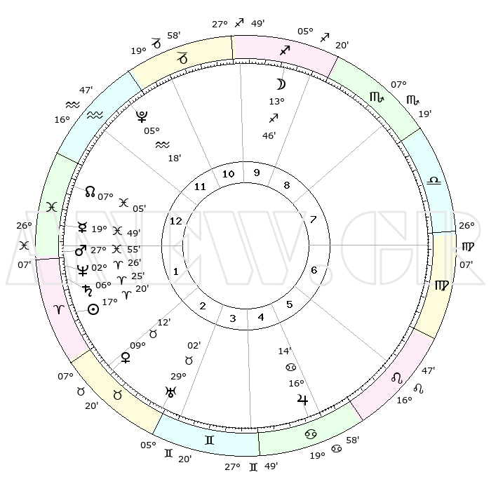 | | ΘΕΣΕΙΣ ΠΛΑΝΗΤΩΝ ΑΣΤΡΟΛΟΓΙΚΟΥ ΧΑΡΤΗ ΤΗΣ ΣΤΙΓΜΗΣ ΑΥΤΗΣ | | | | Πλανήτης | Ζώδιο | Μοίρες | Δεκαήμ. | Σε οίκο | Απόκλιση | | Ακμές των οίκων | | Ηλιος | Κριός | 17°16' | Δεύτερο | 2 | 06 N 47 | | 1ος | 20°56' | Υδροχόος | | Σελήνη | Τοξότης | 13°01' | Δεύτερο | 10 | 27 S 28 | | 2ος | 06°44' | Κριός | | Ερμής | Ιχθείς | 19°44' | Δεύτερο | 1 | 05 S 59 | | 3ος | 11°16' | Ταύρος | | Αφροδίτη | Ταύρος | 09°07' | Πρώτο | 2 | 14 N 21 | | 4ος | 06°40' | Δίδυμοι | | Αρης | Ιχθείς | 27°52' | Τρίτο | 1 | 01 S 47 | | 5ος | 28°28' | Δίδυμοι | | Δίας | Καρκίνος | 16°14' | Δεύτερο | 5 | 22 N 49 | | 6ος | 21°10' | Καρκίνος | | Κρόνος | Κριός | 06°25' | Πρώτο | 1 | 00 N 35 | | 7ος | 20°56' | Λέων | | Ουρανός | Ταύρος | 29°02' | Τρίτο | 3 | 19 N 46 | | 8ος | 06°44' | Ζυγός | | Ποσειδώνας | Κριός | 02°26' | Πρώτο | 1 | 00 S 14 | | 9ος | 11°16' | Σκορπιός | | Πλούτωνας | Υδροχόος | 05°18' | Πρώτο | 12 | 22 S 47 | | 10ος | 06°40' | Τοξότης | | Β. Δεσμός | Ιχθείς | 07°05' | Πρώτο | 1 | 08 S 55 | | 11ος | 28°28' | Τοξότης | | Ωροσκόπος | Υδροχόος | 20°56' | Τρίτο | | | 12ος | 21°10' | Αιγόκερως | | Μεσουράνημα | Τοξότης | 06°40' | Πρώτο | | | |