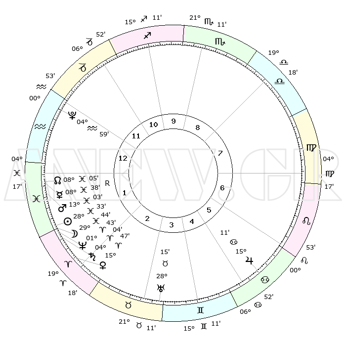 | | ΘΕΣΕΙΣ ΠΛΑΝΗΤΩΝ ΑΣΤΡΟΛΟΓΙΚΟΥ ΧΑΡΤΗ ΤΗΣ ΣΤΙΓΜΗΣ ΑΥΤΗΣ | | | | Πλανήτης | Ζώδιο | Μοίρες | Δεκαήμ. | Σε οίκο | Απόκλιση | | Ακμές των οίκων | | Ηλιος | Ιχθείς | 28°28' | Τρίτο | 2 | 00 S 36 | | 1ος | 27°06' | Αιγόκερως | | Σελήνη | Ιχθείς | 28°39' | Τρίτο | 2 | 01 N 05 | | 2ος | 10°42' | Ιχθείς | | Ερμής | Ιχθείς | 08°39'R | Πρώτο | 1 | 07 S 01 | | 3ος | 19°34' | Κριός | | Αφροδίτη | Κριός | 15°41' | Δεύτερο | 2 | 05 N 19 | | 4ος | 18°33' | Ταύρος | | Αρης | Ιχθείς | 12°59' | Δεύτερο | 2 | 07 S 41 | | 5ος | 11°32' | Δίδυμοι | | Δίας | Καρκίνος | 15°11' | Δεύτερο | 6 | 22 N 56 | | 6ος | 02°52' | Καρκίνος | | Κρόνος | Κριός | 04°03' | Πρώτο | 2 | 00 S 20 | | 7ος | 27°06' | Καρκίνος | | Ουρανός | Ταύρος | 28°15' | Τρίτο | 4 | 19 N 36 | | 8ος | 10°42' | Παρθένος | | Ποσειδώνας | Κριός | 01°43' | Πρώτο | 2 | 00 S 31 | | 9ος | 19°34' | Ζυγός | | Πλούτωνας | Υδροχόος | 04°59' | Πρώτο | 1 | 22 S 49 | | 10ος | 18°33' | Σκορπιός | | Β. Δεσμός | Ιχθείς | 08°05' | Πρώτο | 1 | 08 S 32 | | 11ος | 11°32' | Τοξότης | | Ωροσκόπος | Αιγόκερως | 27°06' | Τρίτο | | | 12ος | 02°52' | Αιγόκερως | | Μεσουράνημα | Σκορπιός | 18°33' | Δεύτερο | | | |