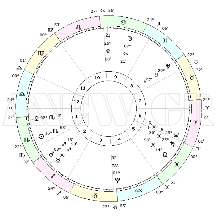 | | ΘΕΣΕΙΣ ΠΛΑΝΗΤΩΝ ΑΣΤΡΟΛΟΓΙΚΟΥ ΧΑΡΤΗ ΤΗΣ ΣΤΙΓΜΗΣ ΑΥΤΗΣ | | | | Πλανήτης | Ζώδιο | Μοίρες | Δεκαήμ. | Σε οίκο | Απόκλιση | | Ακμές των οίκων | | Ηλιος | Σκορπιός | 16°54' | Δεύτερο | 2 | 16 S 53 | | 1ος | 01°23' | Ζυγός | | Σελήνη | Καρκίνος | 06°13' | Πρώτο | 10 | 28 N 03 | | 2ος | 28°04' | Ζυγός | | Ερμής | Τοξότης | 06°49' | Πρώτο | 3 | 23 S 52 | | 3ος | 28°33' | Σκορπιός | | Αφροδίτη | Σκορπιός | 02°39' | Πρώτο | 2 | 11 S 08 | | 4ος | 01°33' | Αιγόκερως | | Αρης | Τοξότης | 03°15' | Πρώτο | 3 | 21 S 16 | | 5ος | 04°31' | Υδροχόος | | Δίας | Καρκίνος | 25°08' | Τρίτο | 10 | 21 N 12 | | 6ος | 04°53' | Ιχθείς | | Κρόνος | Ιχθείς | 25°36'R | Τρίτο | 6 | 03 S 59 | | 7ος | 01°23' | Κριός | | Ουρανός | Ταύρος | 29°57'R | Τρίτο | 9 | 19 N 56 | | 8ος | 28°04' | Κριός | | Ποσειδώνας | Ιχθείς | 29°38'R | Τρίτο | 6 | 01 S 24 | | 9ος | 28°33' | Ταύρος | | Πλούτωνας | Υδροχόος | 01°32' | Πρώτο | 4 | 23 S 29 | | 10ος | 01°33' | Καρκίνος | | Β. Δεσμός | Ιχθείς | 14°58' | Δεύτερο | 6 | 05 S 55 | | 11ος | 04°31' | Λέων | | Ωροσκόπος | Ζυγός | 01°23' | Πρώτο | | | 12ος | 04°53' | Παρθένος | | Μεσουράνημα | Καρκίνος | 01°33' | Πρώτο | | | |