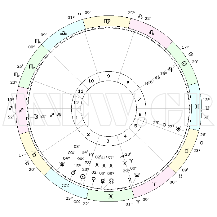 | | ΘΕΣΕΙΣ ΠΛΑΝΗΤΩΝ ΑΣΤΡΟΛΟΓΙΚΟΥ ΧΑΡΤΗ ΤΗΣ ΣΤΙΓΜΗΣ ΑΥΤΗΣ | | | | Πλανήτης | Ζώδιο | Μοίρες | Δεκαήμ. | Σε οίκο | Απόκλιση | | Ακμές των οίκων | | Ηλιος | Υδροχόος | 23°16' | Τρίτο | 3 | 13 S 46 | | 1ος | 26°60' | Σκορπιός | | Σελήνη | Τοξότης | 19°57' | Δεύτερο | 1 | 28 S 12 | | 2ος | 27°44' | Τοξότης | | Ερμής | Ιχθείς | 08°36' | Πρώτο | 3 | 08 S 52 | | 3ος | 02°57' | Υδροχόος | | Αφροδίτη | Ιχθείς | 01°58' | Πρώτο | 3 | 12 S 08 | | 4ος | 08°54' | Ιχθείς | | Αρης | Υδροχόος | 15°21' | Δεύτερο | 3 | 17 S 15 | | 5ος | 10°17' | Κριός | | Δίας | Καρκίνος | 16°16'R | Δεύτερο | 8 | 22 N 46 | | 6ος | 05°45' | Ταύρος | | Κρόνος | Ιχθείς | 29°54' | Τρίτο | 4 | 02 S 01 | | 7ος | 26°60' | Ταύρος | | Ουρανός | Ταύρος | 27°29' | Τρίτο | 7 | 19 N 25 | | 8ος | 27°44' | Δίδυμοι | | Ποσειδώνας | Κριός | 00°28' | Πρώτο | 4 | 01 S 01 | | 9ος | 02°57' | Λέων | | Πλούτωνας | Υδροχόος | 04°03' | Πρώτο | 3 | 22 S 57 | | 10ος | 08°54' | Παρθένος | | Β. Δεσμός | Ιχθείς | 09°57' | Πρώτο | 4 | 07 S 50 | | 11ος | 10°17' | Ζυγός | | Ωροσκόπος | Σκορπιός | 26°60' | Τρίτο | | | 12ος | 05°45' | Σκορπιός | | Μεσουράνημα | Παρθένος | 08°54' | Πρώτο | | | |