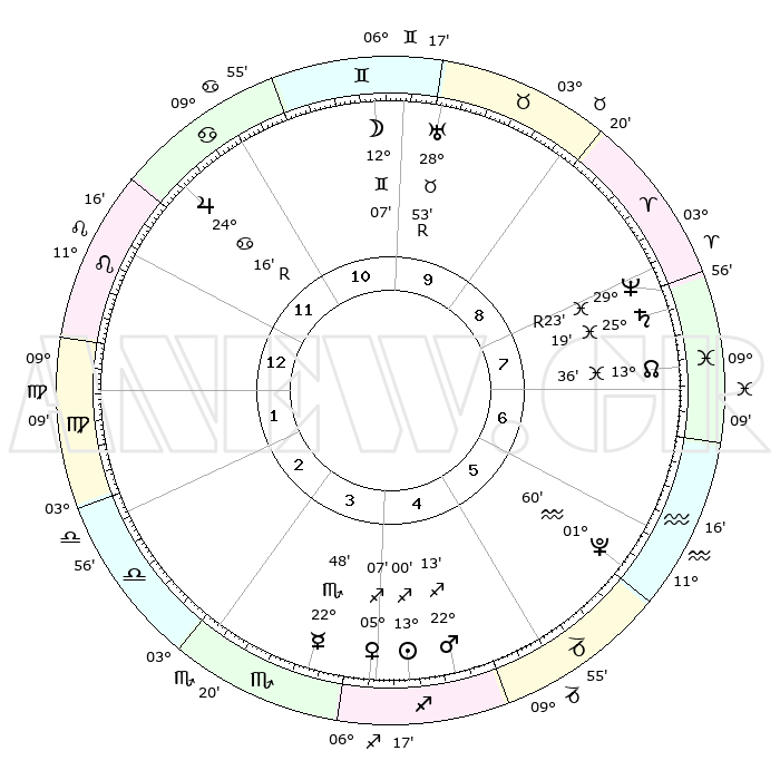 | | ΘΕΣΕΙΣ ΠΛΑΝΗΤΩΝ ΑΣΤΡΟΛΟΓΙΚΟΥ ΧΑΡΤΗ ΤΗΣ ΣΤΙΓΜΗΣ ΑΥΤΗΣ | | | | Πλανήτης | Ζώδιο | Μοίρες | Δεκαήμ. | Σε οίκο | Απόκλιση | | Ακμές των οίκων | | Ηλιος | Τοξότης | 12°58' | Δεύτερο | 4 | 22 S 21 | | 1ος | 26°48' | Λέων | | Σελήνη | Δίδυμοι | 11°28' | Δεύτερο | 10 | 27 N 06 | | 2ος | 20°19' | Παρθένος | | Ερμής | Σκορπιός | 22°46' | Τρίτο | 4 | 16 S 00 | | 3ος | 18°41' | Ζυγός | | Αφροδίτη | Τοξότης | 05°04' | Πρώτο | 4 | 20 S 35 | | 4ος | 21°33' | Σκορπιός | | Αρης | Τοξότης | 22°11' | Τρίτο | 4 | 23 S 54 | | 5ος | 25°58' | Τοξότης | | Δίας | Καρκίνος | 24°16'R | Τρίτο | 11 | 21 N 25 | | 6ος | 28°11' | Αιγόκερως | | Κρόνος | Ιχθείς | 25°19' | Τρίτο | 8 | 04 S 01 | | 7ος | 26°48' | Υδροχόος | | Ουρανός | Ταύρος | 28°53'R | Τρίτο | 10 | 19 N 42 | | 8ος | 20°19' | Ιχθείς | | Ποσειδώνας | Ιχθείς | 29°23'R | Τρίτο | 8 | 01 S 29 | | 9ος | 18°41' | Κριός | | Πλούτωνας | Υδροχόος | 01°60' | Πρώτο | 6 | 23 S 23 | | 10ος | 21°33' | Ταύρος | | Β. Δεσμός | Ιχθείς | 13°36' | Δεύτερο | 7 | 06 S 27 | | 11ος | 25°58' | Δίδυμοι | | Ωροσκόπος | Λέων | 26°48' | Τρίτο | | | 12ος | 28°11' | Καρκίνος | | Μεσουράνημα | Ταύρος | 21°33' | Τρίτο | | | |