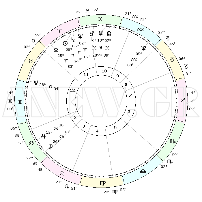 | | ΘΕΣΕΙΣ ΠΛΑΝΗΤΩΝ ΑΣΤΡΟΛΟΓΙΚΟΥ ΧΑΡΤΗ ΤΗΣ ΣΤΙΓΜΗΣ ΑΥΤΗΣ | | | | Πλανήτης | Ζώδιο | Μοίρες | Δεκαήμ. | Σε οίκο | Απόκλιση | | Ακμές των οίκων | | Ηλιος | Κριός | 06°36' | Πρώτο | 11 | 02 N 37 | | 1ος | 23°00' | Ταύρος | | Σελήνη | Καρκίνος | 25°35' | Τρίτο | 3 | 24 N 32 | | 2ος | 19°19' | Δίδυμοι | | Ερμής | Ιχθείς | 10°22' | Δεύτερο | 11 | 08 S 06 | | 3ος | 11°03' | Καρκίνος | | Αφροδίτη | Κριός | 25°49' | Τρίτο | 12 | 09 N 23 | | 4ος | 03°22' | Λέων | | Αρης | Ιχθείς | 19°25' | Δεύτερο | 11 | 05 S 10 | | 5ος | 00°41' | Παρθένος | | Δίας | Καρκίνος | 15°30' | Δεύτερο | 3 | 22 N 54 | | 6ος | 07°56' | Ζυγός | | Κρόνος | Κριός | 05°04' | Πρώτο | 11 | 00 N 04 | | 7ος | 23°00' | Σκορπιός | | Ουρανός | Ταύρος | 28°34' | Τρίτο | 1 | 19 N 40 | | 8ος | 19°19' | Τοξότης | | Ποσειδώνας | Κριός | 02°02' | Πρώτο | 11 | 00 S 24 | | 9ος | 11°03' | Αιγόκερως | | Πλούτωνας | Υδροχόος | 05°08' | Πρώτο | 10 | 22 S 48 | | 10ος | 03°22' | Υδροχόος | | Β. Δεσμός | Ιχθείς | 07°39' | Πρώτο | 11 | 08 S 42 | | 11ος | 00°41' | Ιχθείς | | Ωροσκόπος | Ταύρος | 23°00' | Τρίτο | | | 12ος | 07°56' | Κριός | | Μεσουράνημα | Υδροχόος | 03°22' | Πρώτο | | | |