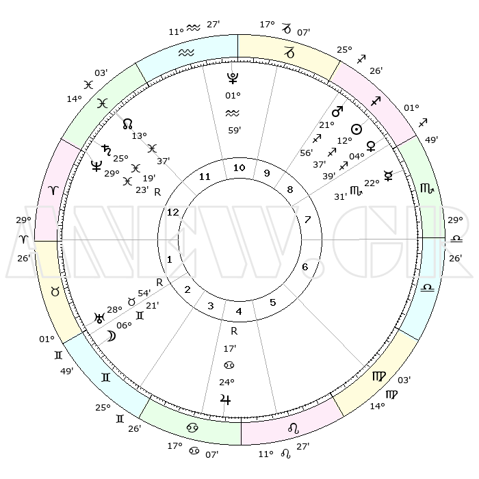 | | ΘΕΣΕΙΣ ΠΛΑΝΗΤΩΝ ΑΣΤΡΟΛΟΓΙΚΟΥ ΧΑΡΤΗ ΤΗΣ ΣΤΙΓΜΗΣ ΑΥΤΗΣ | | | | Πλανήτης | Ζώδιο | Μοίρες | Δεκαήμ. | Σε οίκο | Απόκλιση | | Ακμές των οίκων | | Ηλιος | Τοξότης | 12°35' | Δεύτερο | 8 | 22 S 18 | | 1ος | 12°14' | Κριός | | Σελήνη | Δίδυμοι | 05°53' | Πρώτο | 2 | 26 N 09 | | 2ος | 19°22' | Ταύρος | | Ερμής | Σκορπιός | 22°30' | Τρίτο | 8 | 15 S 55 | | 3ος | 15°01' | Δίδυμοι | | Αφροδίτη | Τοξότης | 04°37' | Πρώτο | 8 | 20 S 29 | | 4ος | 06°54' | Καρκίνος | | Αρης | Τοξότης | 21°54' | Τρίτο | 9 | 23 S 53 | | 5ος | 29°52' | Καρκίνος | | Δίας | Καρκίνος | 24°18'R | Τρίτο | 4 | 21 N 25 | | 6ος | 29°16' | Λέων | | Κρόνος | Ιχθείς | 25°19' | Τρίτο | 12 | 04 S 01 | | 7ος | 12°14' | Ζυγός | | Ουρανός | Ταύρος | 28°54'R | Τρίτο | 2 | 19 N 43 | | 8ος | 19°22' | Σκορπιός | | Ποσειδώνας | Ιχθείς | 29°23'R | Τρίτο | 12 | 01 S 29 | | 9ος | 15°01' | Τοξότης | | Πλούτωνας | Υδροχόος | 01°59' | Πρώτο | 11 | 23 S 23 | | 10ος | 06°54' | Αιγόκερως | | Β. Δεσμός | Ιχθείς | 13°38' | Δεύτερο | 12 | 06 S 26 | | 11ος | 29°52' | Αιγόκερως | | Ωροσκόπος | Κριός | 12°14' | Δεύτερο | | | 12ος | 29°16' | Υδροχόος | | Μεσουράνημα | Αιγόκερως | 06°54' | Πρώτο | | | |