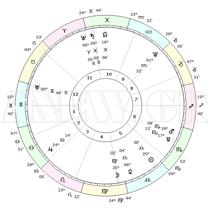 | ΘΕΣΕΙΣ ΠΛΑΝΗΤΩΝ ΑΣΤΡΟΛΟΓΙΚΟΥ ΧΑΡΤΗ ΤΗΣ ΣΤΙΓΜΗΣ ΑΥΤΗΣ | | Πλανήτης | Ζώδιο | Μοίρες | Δεκαήμ. | Σε οίκο | Απόκλιση | | Ακμές των οίκων | Ηλιος | Ζυγός | 25°32' | Τρίτο | 6 | 09 S 52 | | 1ος | 02°29' | Ταύρος | Σελήνη | Παρθένος | 23°51' | Τρίτο | 6 | 01 N 57 | | 2ος | 04°01' | Δίδυμοι | Ερμής | Σκορπιός | 17°04' | Δεύτερο | 7 | 18 S 57 | | 3ος | 27°20' | Δίδυμοι | Αφροδίτη | Ζυγός | 05°57' | Πρώτο | 6 | 00 S 57 | | 4ος | 19°02' | Καρκίνος | Αρης | Σκορπιός | 18°04' | Δεύτερο | 7 | 17 S 27 | | 5ος | 13°41' | Λέων | Δίας | Καρκίνος | 24°13' | Τρίτο | 4 | 21 N 19 | | 6ος | 16°53' | Παρθένος | Κρόνος | Ιχθείς | 26°39'R | Τρίτο | 12 | 03 S 37 | | 7ος | 02°29' | Σκορπιός | Ουρανός | Δίδυμοι | 00°45'R | Πρώτο | 1 | 20 N 06 | | 8ος | 04°01' | Τοξότης | Ποσειδώνας | Κριός | 00°05'R | Πρώτο | 12 | 01 S 14 | | 9ος | 27°20' | Τοξότης | Πλούτωνας | Υδροχόος | 01°22' | Πρώτο | 10 | 23 S 32 | | 10ος | 19°02' | Αιγόκερως | Β. Δεσμός | Ιχθείς | 16°06' | Δεύτερο | 11 | 05 S 29 | | 11ος | 13°41' | Υδροχόος | Ωροσκόπος | Ταύρος | 02°29' | Πρώτο | | | 12ος | 16°53' | Ιχθείς | Μεσουράνημα | Αιγόκερως | 19°02' | Δεύτερο | | | |