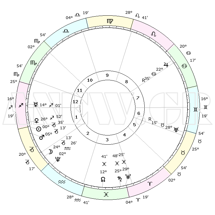| | ΘΕΣΕΙΣ ΠΛΑΝΗΤΩΝ ΑΣΤΡΟΛΟΓΙΚΟΥ ΧΑΡΤΗ ΤΗΣ ΣΤΙΓΜΗΣ ΑΥΤΗΣ | | | | Πλανήτης | Ζώδιο | Μοίρες | Δεκαήμ. | Σε οίκο | Απόκλιση | | Ακμές των οίκων | | Ηλιος | Αιγόκερως | 00°30' | Πρώτο | 2 | 23 S 26 | | 1ος | 24°41' | Σκορπιός | | Σελήνη | Αιγόκερως | 23°19' | Τρίτο | 2 | 25 S 07 | | 2ος | 25°08' | Τοξότης | | Ερμής | Τοξότης | 13°55' | Δεύτερο | 1 | 21 S 51 | | 3ος | 29°59' | Αιγόκερως | | Αφροδίτη | Τοξότης | 26°47' | Τρίτο | 2 | 23 S 31 | | 4ος | 05°51' | Ιχθείς | | Αρης | Αιγόκερως | 05°10' | Πρώτο | 2 | 24 S 09 | | 5ος | 07°29' | Κριός | | Δίας | Καρκίνος | 22°35'R | Τρίτο | 8 | 21 N 45 | | 6ος | 03°15' | Ταύρος | | Κρόνος | Ιχθείς | 25°47' | Τρίτο | 4 | 03 S 47 | | 7ος | 24°41' | Ταύρος | | Ουρανός | Ταύρος | 28°15'R | Τρίτο | 7 | 19 N 34 | | 8ος | 25°08' | Δίδυμοι | | Ποσειδώνας | Ιχθείς | 29°25' | Τρίτο | 4 | 01 S 28 | | 9ος | 29°59' | Καρκίνος | | Πλούτωνας | Υδροχόος | 02°26' | Πρώτο | 3 | 23 S 17 | | 10ος | 05°51' | Παρθένος | | Β. Δεσμός | Ιχθείς | 12°42' | Δεύτερο | 4 | 06 S 48 | | 11ος | 07°29' | Ζυγός | | Ωροσκόπος | Σκορπιός | 24°41' | Τρίτο | | | 12ος | 03°15' | Σκορπιός | | Μεσουράνημα | Παρθένος | 05°51' | Πρώτο | | | |