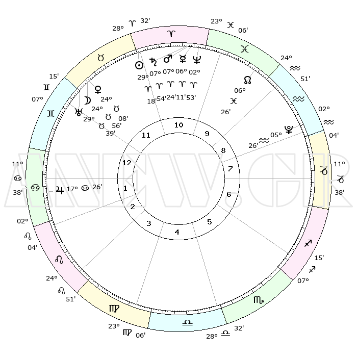 | | ΘΕΣΕΙΣ ΠΛΑΝΗΤΩΝ ΑΣΤΡΟΛΟΓΙΚΟΥ ΧΑΡΤΗ ΤΗΣ ΣΤΙΓΜΗΣ ΑΥΤΗΣ | | | | Πλανήτης | Ζώδιο | Μοίρες | Δεκαήμ. | Σε οίκο | Απόκλιση | | Ακμές των οίκων | | Ηλιος | Κριός | 29°14' | Τρίτο | 11 | 11 N 12 | | 1ος | 21°49' | Δίδυμοι | | Σελήνη | Ταύρος | 24°02' | Τρίτο | 12 | 23 N 35 | | 2ος | 13°16' | Καρκίνος | | Ερμής | Κριός | 06°05' | Πρώτο | 11 | 00 N 00 | | 3ος | 04°39' | Λέων | | Αφροδίτη | Ταύρος | 24°03' | Τρίτο | 12 | 19 N 08 | | 4ος | 29°45' | Λέων | | Αρης | Κριός | 07°21' | Πρώτο | 11 | 02 N 02 | | 5ος | 02°16' | Ζυγός | | Δίας | Καρκίνος | 17°26' | Δεύτερο | 2 | 22 N 41 | | 6ος | 12°34' | Σκορπιός | | Κρόνος | Κριός | 07°54' | Πρώτο | 11 | 01 N 09 | | 7ος | 21°49' | Τοξότης | | Ουρανός | Ταύρος | 29°39' | Τρίτο | 12 | 19 N 54 | | 8ος | 13°16' | Αιγόκερως | | Ποσειδώνας | Κριός | 02°52' | Πρώτο | 11 | 00 S 04 | | 9ος | 04°39' | Υδροχόος | | Πλούτωνας | Υδροχόος | 05°26' | Πρώτο | 9 | 22 S 48 | | 10ος | 29°45' | Υδροχόος | | Β. Δεσμός | Ιχθείς | 06°26' | Πρώτο | 10 | 09 S 09 | | 11ος | 02°16' | Κριός | | Ωροσκόπος | Δίδυμοι | 21°49' | Τρίτο | | | 12ος | 12°34' | Ταύρος | | Μεσουράνημα | Υδροχόος | 29°45' | Τρίτο | | | |