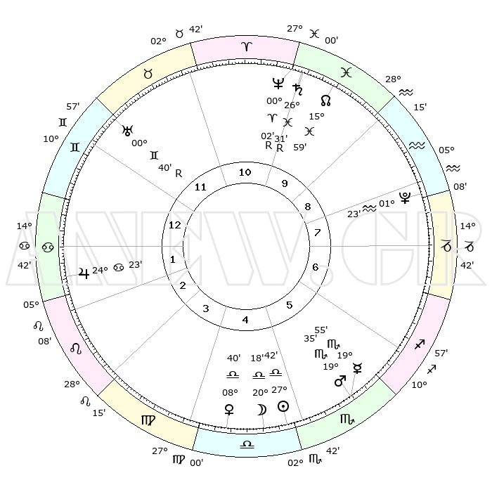 | ΘΕΣΕΙΣ ΠΛΑΝΗΤΩΝ ΑΣΤΡΟΛΟΓΙΚΟΥ ΧΑΡΤΗ ΤΗΣ ΣΤΙΓΜΗΣ ΑΥΤΗΣ | | Πλανήτης | Ζώδιο | Μοίρες | Δεκαήμ. | Σε οίκο | Απόκλιση | | Ακμές των οίκων | Ηλιος | Ζυγός | 27°34' | Τρίτο | 6 | 10 S 36 | | 1ος | 28°28' | Ταύρος | Σελήνη | Ζυγός | 18°44' | Δεύτερο | 6 | 09 S 47 | | 2ος | 23°35' | Δίδυμοι | Ερμής | Σκορπιός | 19°45' | Δεύτερο | 6 | 19 S 53 | | 3ος | 15°04' | Καρκίνος | Αφροδίτη | Ζυγός | 08°30' | Πρώτο | 5 | 01 S 57 | | 4ος | 07°43' | Λέων | Αρης | Σκορπιός | 19°30' | Δεύτερο | 6 | 17 S 52 | | 5ος | 05°55' | Παρθένος | Δίας | Καρκίνος | 24°22' | Τρίτο | 3 | 21 N 18 | | 6ος | 14°07' | Ζυγός | Κρόνος | Ιχθείς | 26°31'R | Τρίτο | 11 | 03 S 40 | | 7ος | 28°28' | Σκορπιός | Ουρανός | Δίδυμοι | 00°40'R | Πρώτο | 1 | 20 N 05 | | 8ος | 23°35' | Τοξότης | Ποσειδώνας | Κριός | 00°02'R | Πρώτο | 11 | 01 S 15 | | 9ος | 15°04' | Αιγόκερως | Πλούτωνας | Υδροχόος | 01°23' | Πρώτο | 9 | 23 S 32 | | 10ος | 07°43' | Υδροχόος | Β. Δεσμός | Ιχθείς | 15°60' | Δεύτερο | 11 | 05 S 31 | | 11ος | 05°55' | Ιχθείς | Ωροσκόπος | Ταύρος | 28°28' | Τρίτο | | | 12ος | 14°07' | Κριός | Μεσουράνημα | Υδροχόος | 07°43' | Πρώτο | | | |