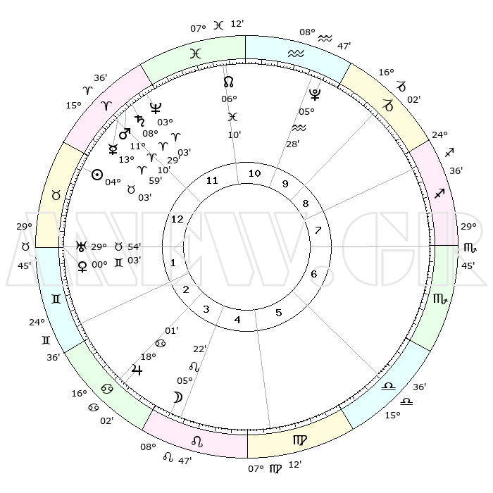 | | ΘΕΣΕΙΣ ΠΛΑΝΗΤΩΝ ΑΣΤΡΟΛΟΓΙΚΟΥ ΧΑΡΤΗ ΤΗΣ ΣΤΙΓΜΗΣ ΑΥΤΗΣ | | | | Πλανήτης | Ζώδιο | Μοίρες | Δεκαήμ. | Σε οίκο | Απόκλιση | | Ακμές των οίκων | | Ηλιος | Ταύρος | 03°59' | Πρώτο | 1 | 12 N 51 | | 1ος | 29°35' | Κριός | | Σελήνη | Λέων | 04°30' | Πρώτο | 4 | 21 N 49 | | 2ος | 01°55' | Δίδυμοι | | Ερμής | Κριός | 13°52' | Δεύτερο | 12 | 03 N 11 | | 3ος | 25°31' | Δίδυμοι | | Αφροδίτη | Ταύρος | 29°59' | Τρίτο | 1 | 20 N 43 | | 4ος | 17°12' | Καρκίνος | | Αρης | Κριός | 11°07' | Δεύτερο | 12 | 03 N 32 | | 5ος | 11°34' | Λέων | | Δίας | Καρκίνος | 18°01' | Δεύτερο | 4 | 22 N 36 | | 6ος | 14°11' | Παρθένος | | Κρόνος | Κριός | 08°28' | Πρώτο | 12 | 01 N 23 | | 7ος | 29°35' | Ζυγός | | Ουρανός | Ταύρος | 29°54' | Τρίτο | 1 | 19 N 58 | | 8ος | 01°55' | Τοξότης | | Ποσειδώνας | Κριός | 03°02' | Πρώτο | 12 | 00 N 00 | | 9ος | 25°31' | Τοξότης | | Πλούτωνας | Υδροχόος | 05°28' | Πρώτο | 10 | 22 S 48 | | 10ος | 17°12' | Αιγόκερως | | Β. Δεσμός | Ιχθείς | 06°11' | Πρώτο | 11 | 09 S 15 | | 11ος | 11°34' | Υδροχόος | | Ωροσκόπος | Κριός | 29°35' | Τρίτο | | | 12ος | 14°11' | Ιχθείς | | Μεσουράνημα | Αιγόκερως | 17°12' | Δεύτερο | | | |